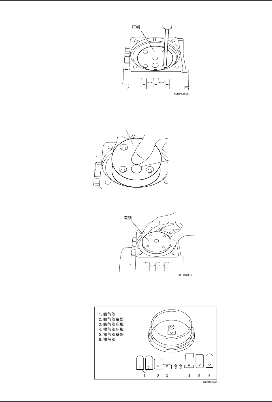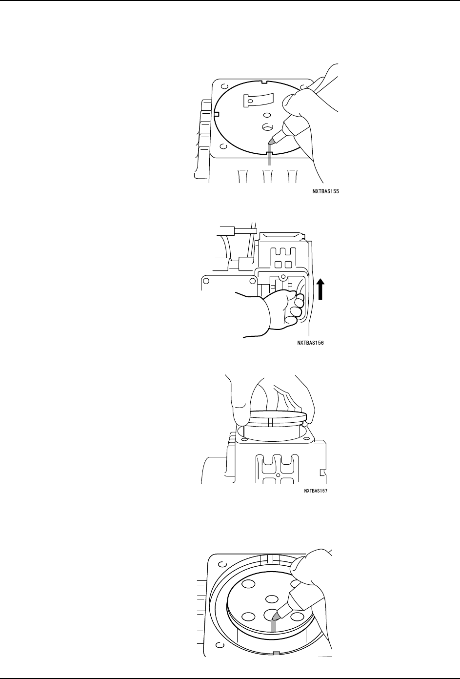6. 消耗品的更换 MEC-NXTIIc-3.3S 388 NXT IIc 机械手册 4. 拆下汽缸。 a. 在拆下汽缸前,用油性笔在外壳和 汽缸上做标记。 b. 用戴有手套的手,满满地将风扇向 上旋转。此时,请必须戴手套。 c. 将汽缸向上拔起。 5. 拆下压板和盖垫。 a. 对准外壳的标记部,用油性笔在压 板上做标记。