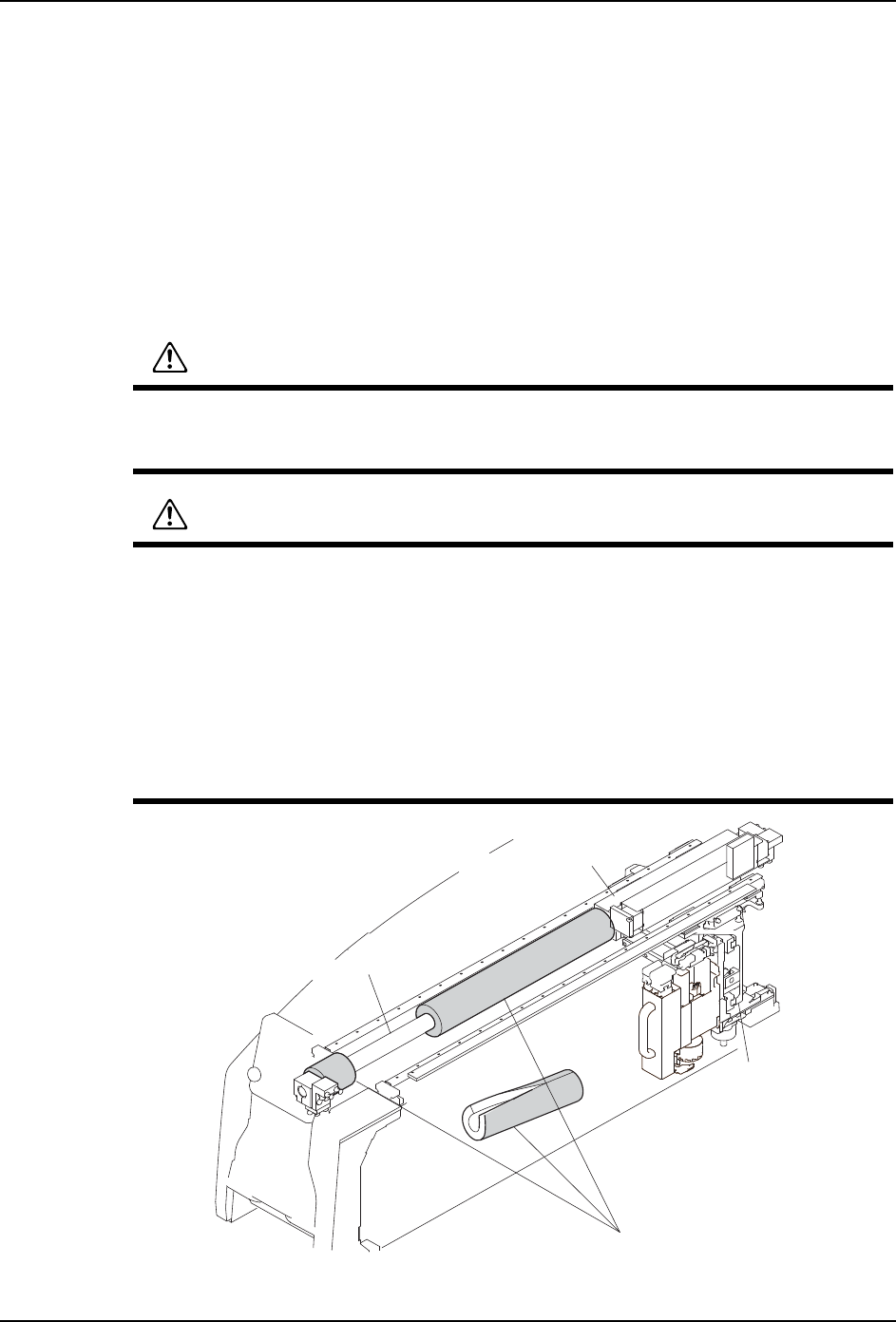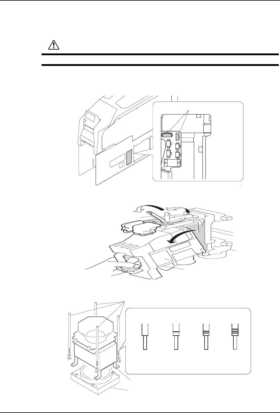 7. 部件的更换 MEC-NXTIIc-3.3S 408 NXT IIc 机械手册 1. 拉出模组。 (参考 「4.1 模组的拉出 / 插入」 ) 2. 将主电源 开关 OFF 。 3. 请在线性马达轴处于常温后,安装 保护盖罩。 4. 请从模组右侧的开口部内的接插头 筋板安装元件相机光源的导线。 5. 用螺丝刀将固定盖罩的螺丝 (4 根)松开后拆下。 6. 用六角螺丝刀拧松 4 根螺栓并拆除。请小心地拆 除照明单元。 警告 在更换元件…