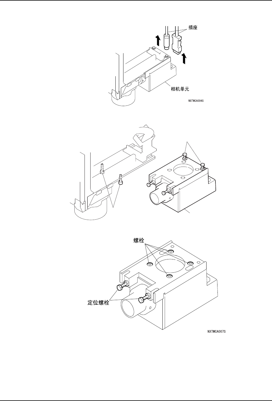 7. 部件的更换 MEC-NXTIIc-3.3S 412 NXT IIc 机械手册 7. 将相机后部的插座拆下。 8 . 拧 松 螺 栓( 2根)帽 和 六 角 螺 栓( 2根) 、 将 相 机 向 后 方 滑 出 并 取 下 。 注意 )请绝对不要松动相机单元的螺栓和定位栓。 1;70&$6E Ⳍᴎऩܗ ݁㾦㶎ᷧ 㧔 Փ⫼0݁㾦ᡇ 㧕 㶎ᷧᐑ 㧔 Փ⫼0݁㾦ᡇ 㧕
