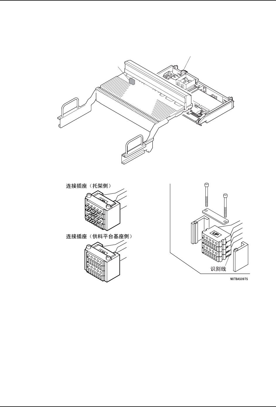 7. 部件的更换 MEC-NXTIIc-3.3S 476 NXT IIc 机械手册 7.19 料站托架 · 基座之间插座的更换 万一分解料站托架 · 基座部分的时候,请按照下 述要点组装插座。 7.19.1 必须工具 六角扳手套件 7.19.2 M3-2c 模组的时候 1. 将主电源 开关 OFF 。 2. 在托架和托架基座上的图示位置上 有用于布线的组合插座。 3. 万一产生有必要拆除插座而分解插 座后,在复原时请对齐侧面的识别线装上…