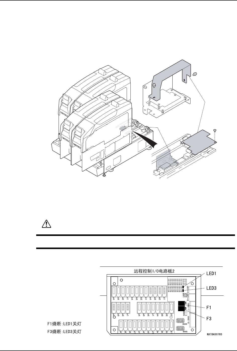 MEC-NXTIIc-3.3S 6. 消耗品的更换 NXT IIc 机械手册 347 6.12.3 远程控制 I/O 电路板 1 (2M-2c 基座 ) 1. 请接通模组的电源。 2. 请拉出左侧的模组。背靠背的时候 ,请拆除模组。 (参考 「 4.1 模组的拉出 / 插入 」 「 4.2 模组的 拆除 / 安装 」 ) 3. 请将防静电腕带戴在手腕上。 4. 请拆除远程控制 I/O 电路板的盖板。 5. 确认烧断的保险丝是哪一根后,将…
