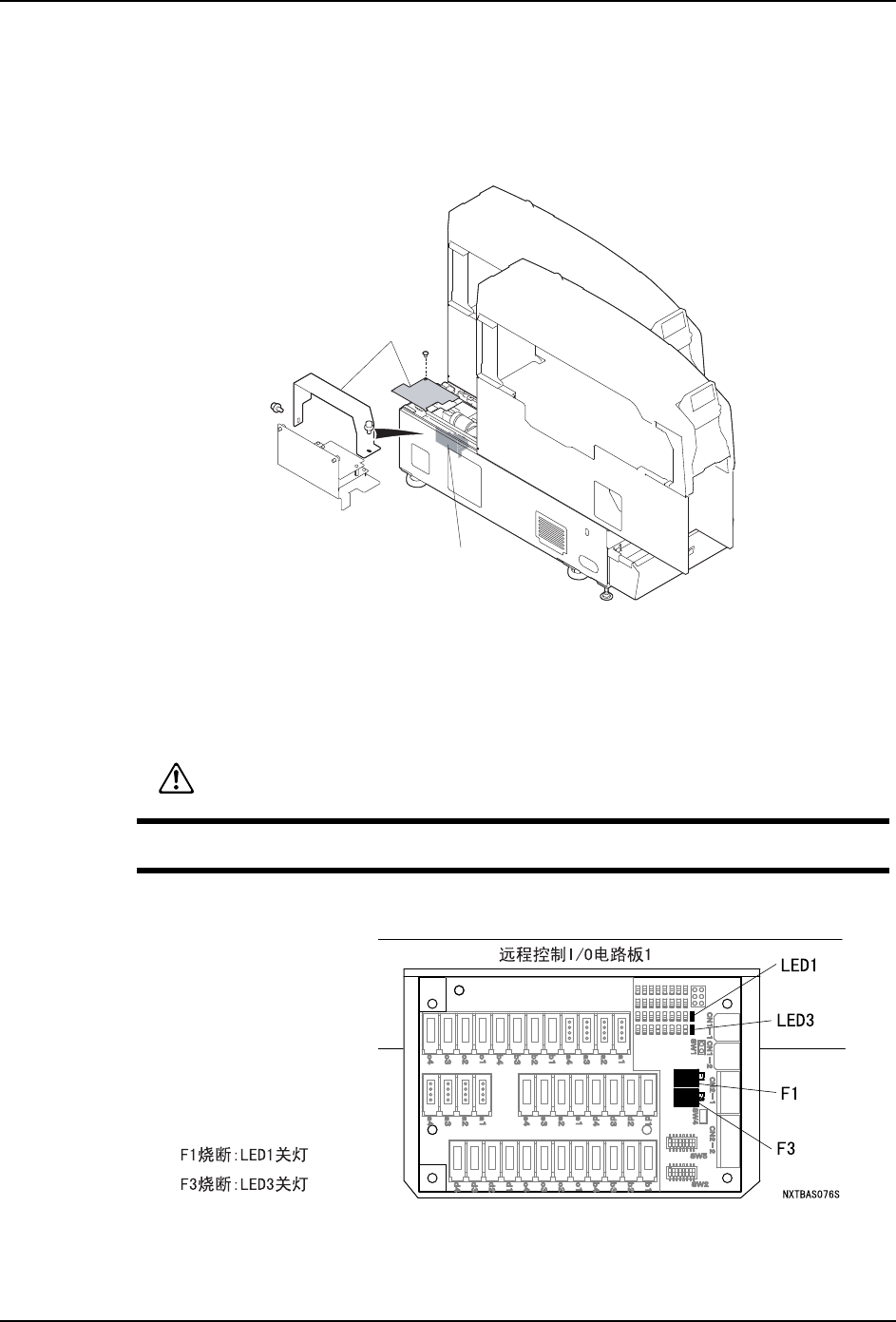 以下显示出基座控制箱的位置。基座控制箱的 I/O 电路板上的保险丝烧断时, 检查保险丝
