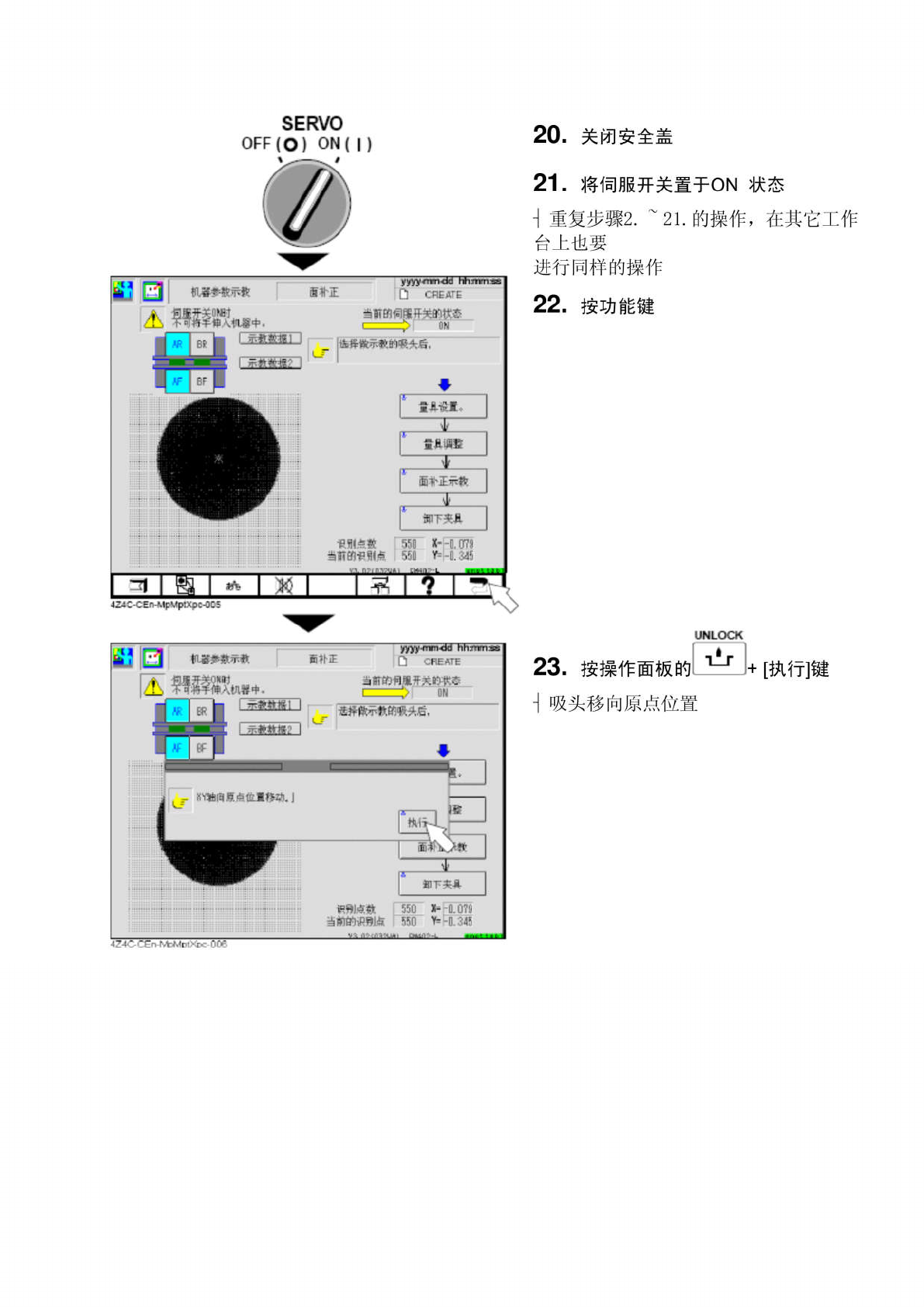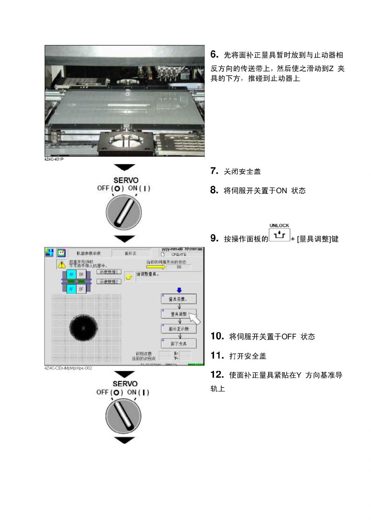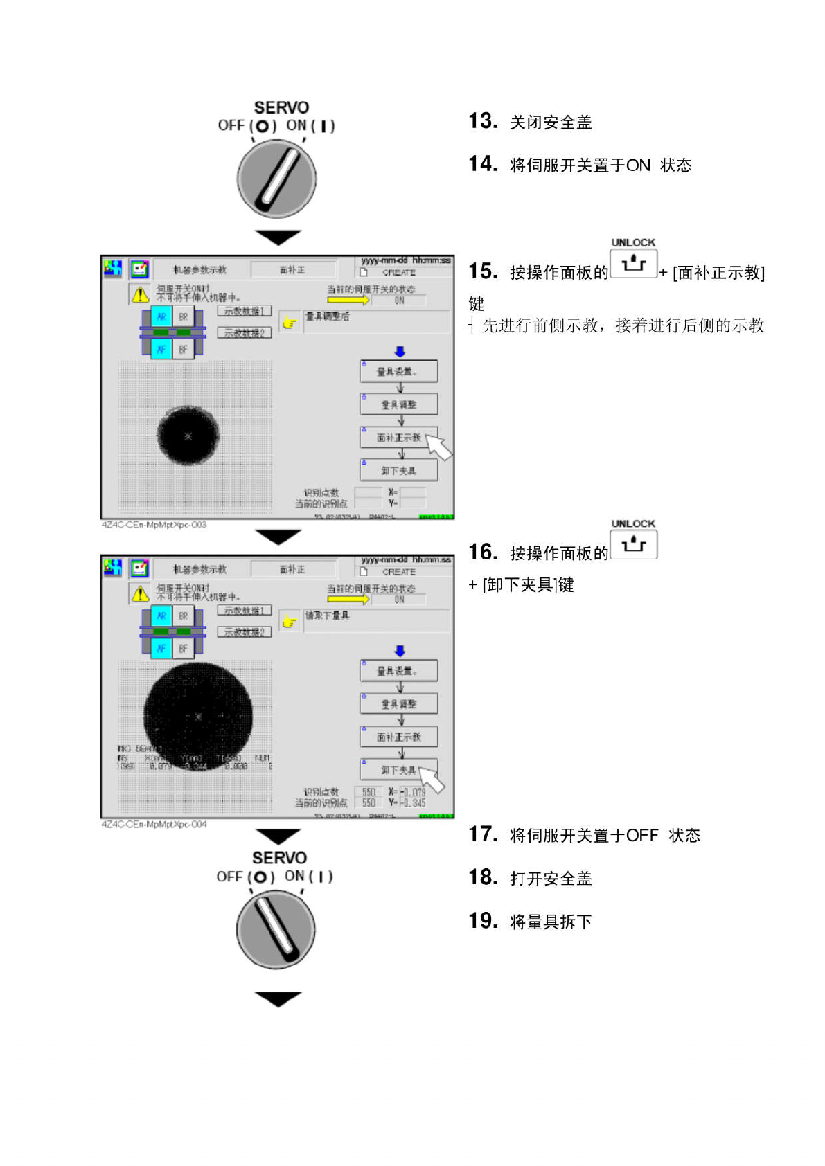 SERVO OFF ( O ) ON ⑴ 1 3 . 关 闭 安 全 盖 1 4 . 将 伺 服 开 关 置 于 ON 状 态 1 5 . 按 操 作 面 板 的 J + 【 面 补 正 示 教 I fi 朴正 Q \ / h 娜 w 当 IT 的 1 开关的欢态 键 m 调 5 甩 d 先进行前侧示教 , 接着进行后侧的示教 fi 晨没置 f 具 * 5 a 扑正云轂 T m \ a . 9 i iSI 的识 w 麻 1 6 . …