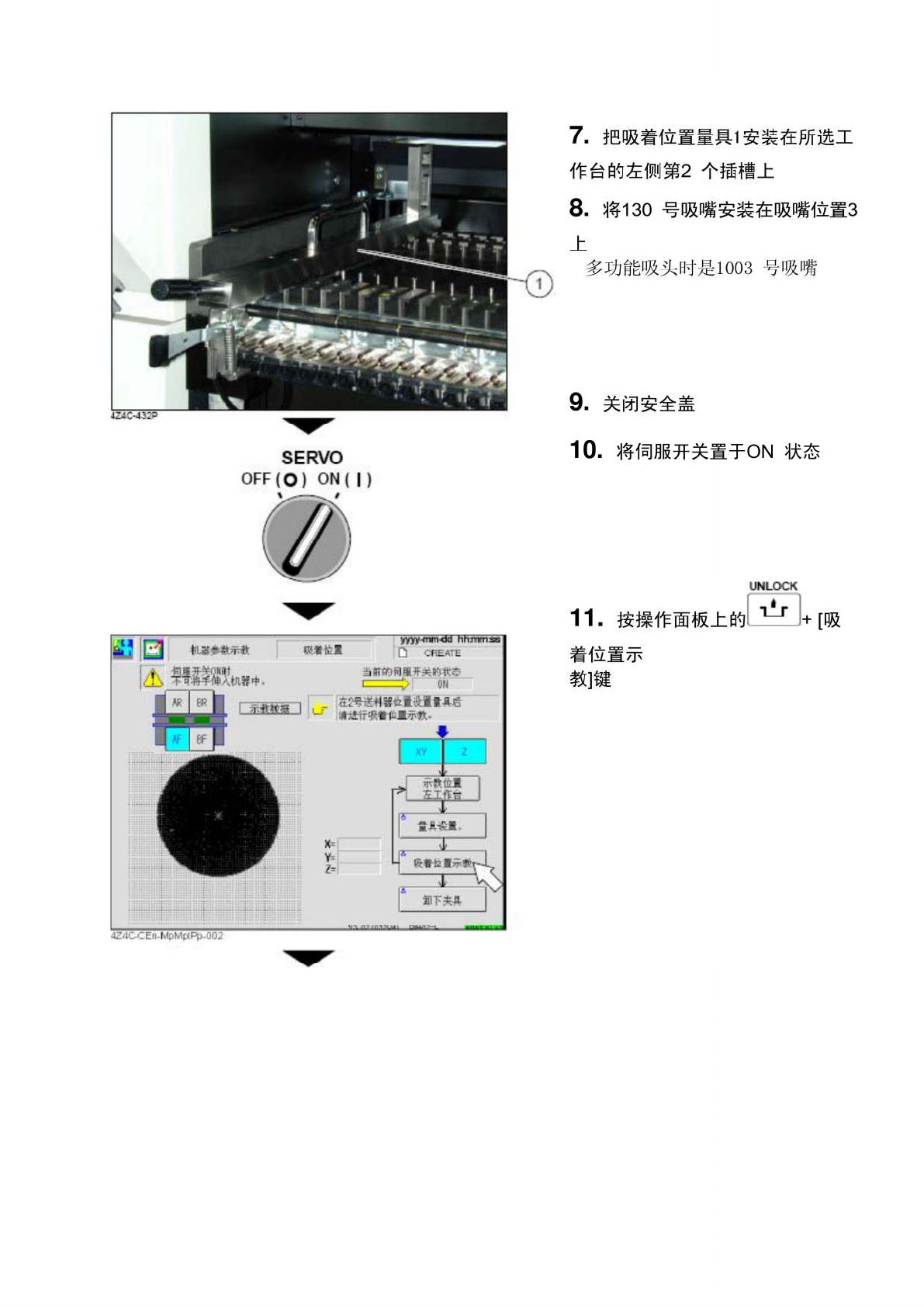 把吸着位置量具 1 安装在所选工 J 的左侧第 2 个插槽上 将 130 号吸嘴安装在吸嘴位置 3 多功能吸头时是 1003 号吸嘴 关闭安全盖 10 . 将伺服开关置于 ON 状态 S E R V O O F F ( O ) O N ( | ) UNLOCK 11 . 按操作面板上的 着位置示 教 ] 键 + [ 吸 430 D