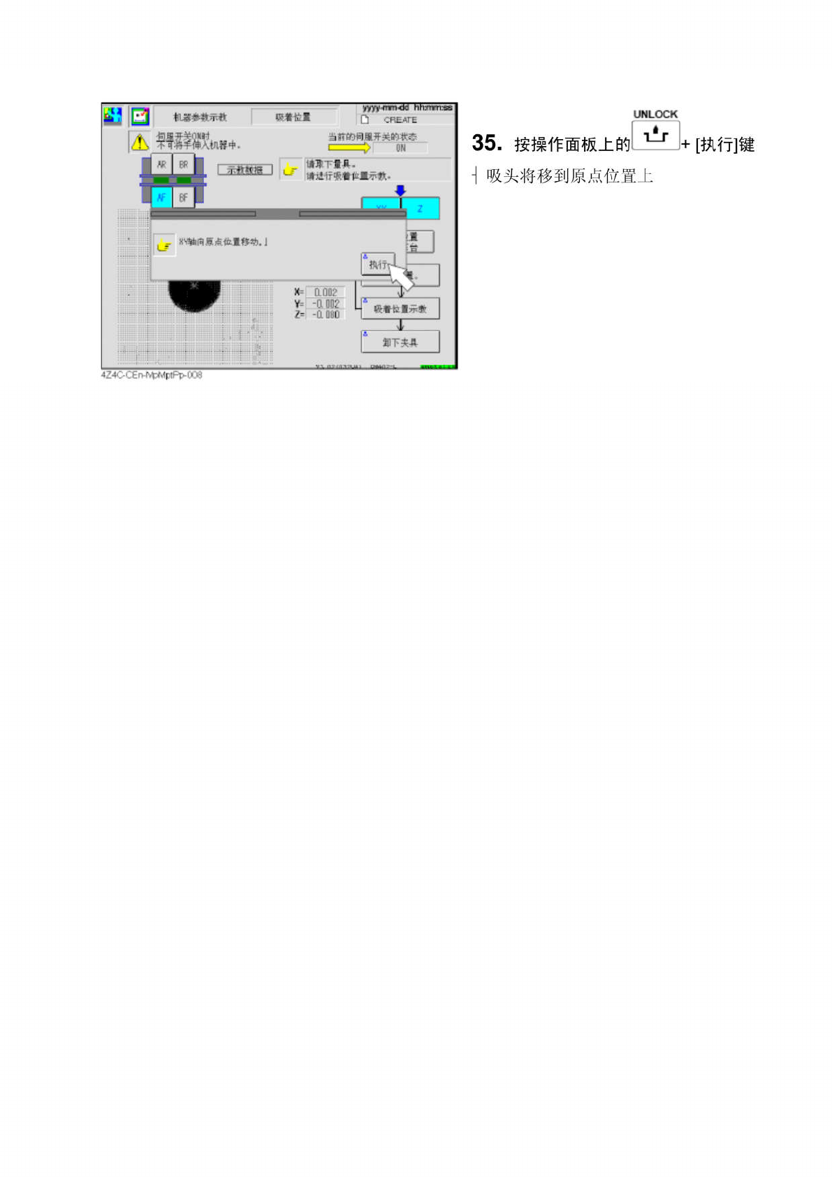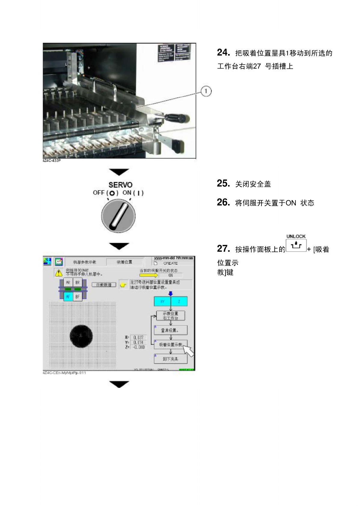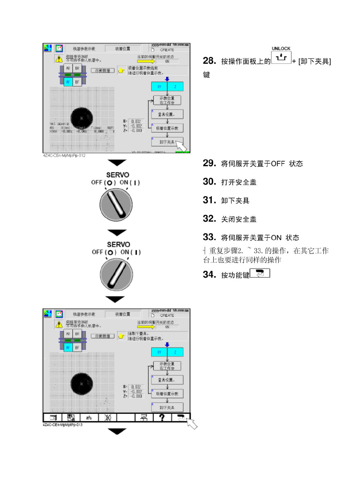 □ ilr A 2 8 . 按 操 作 面 板 上 的 + [ 卸 下 夹 具 1 戀 « * lti £ 键 £ 1 ^ 2 9 . 将 伺 服 开 关 置 于 OFF 状 态 SERVO OFF ( Q ) ON ⑴ 3 0 . 打 开 安 全 盖 3 1 . 卸 下 夹 具 3 2 . 关 闭 安 全 盖 3 3 . 将 伺 服 开 关 置 于 ON 状 态 • I 重复步骤 2 . 33 . 的操作 , 在其它工作 台上也要进行…