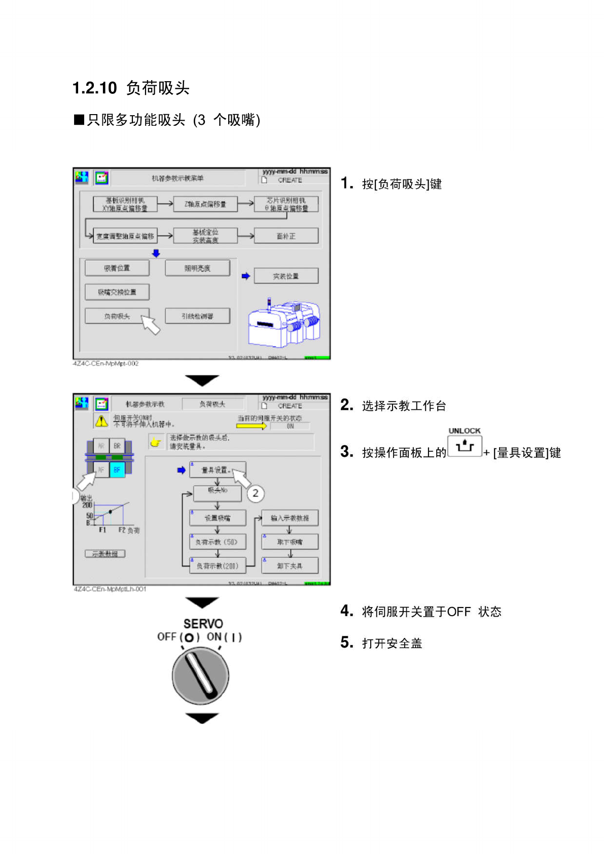 6 . 将量具 1 安装在实装工作台上 7 . 关闭安全盖 SERVO OFF ( O ) 0 N ( | ) 8 . 将伺服开关置于 ON 状态 。 9 . 确认 ‘ 吸头 No ’ 的显示是否已变为示教 吸头的号码要转换显示状态时 , 请击点按 钮一直到吸头 No 显示出想要的号码 垚 IT 的 网 雇 开 关 的 欢 态 r - rir - ; ON UNLOCK 安 安 於 Mr . 10 . 按操作面板上的 | + [ 设置吸…