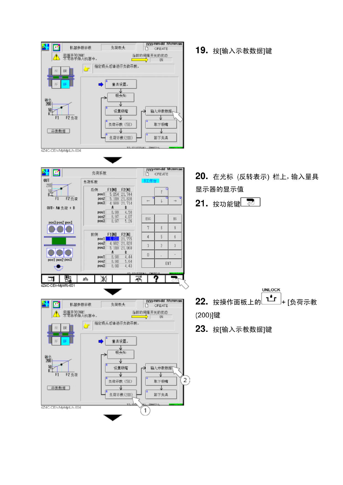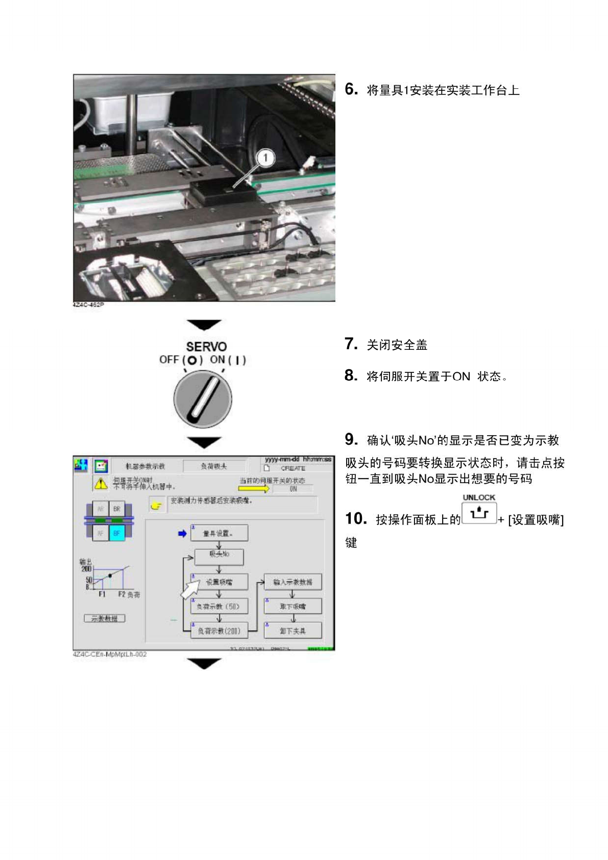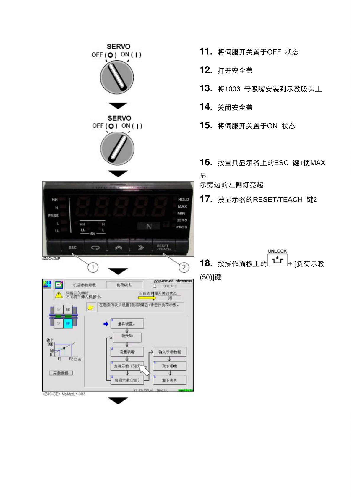 SERVO O F F ( O ) O N ( | ) 11 . 将伺服开关置于 OFF 状态 12 . 打开安全盖 13 . 将 1003 号吸嘴安装到示教吸头上 14 . 关闭安全盖 SERVO O F F ( O ) O N ( | ) 15 . 将伺服开关置于 ON 状态 16 . 按量具显示器上的 ESC 键 1 使 MAX 显 示旁边的左侧灯亮起 17 . 按显示器的 RESET / TEACH 键 2 18 . 按操作面板…