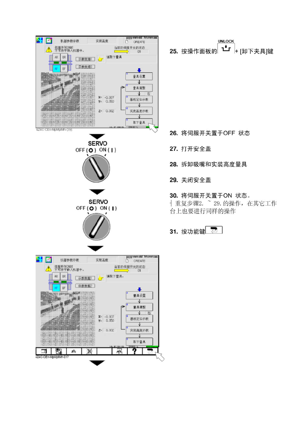 S E R V O O F F ( O ) O N ( | ) 2 1 . 关 闭 安 全 盖 2 2 . 将 伺 服 开 关 置 于 ON 状 态 UNLOCK 心 I 2 3 . 按 操 作 面 板 的 + [ 基 板 定 位 示 实装葛廣 D CREATE 当 IT 的词 jt 开关的状 e / h 爾 翱 w 教 ] ON 1 ^ T ^ t ] [ M 谵霣整置翼 • 键 ] W 进行示教操作 fA ^ JI 鐵 : f …