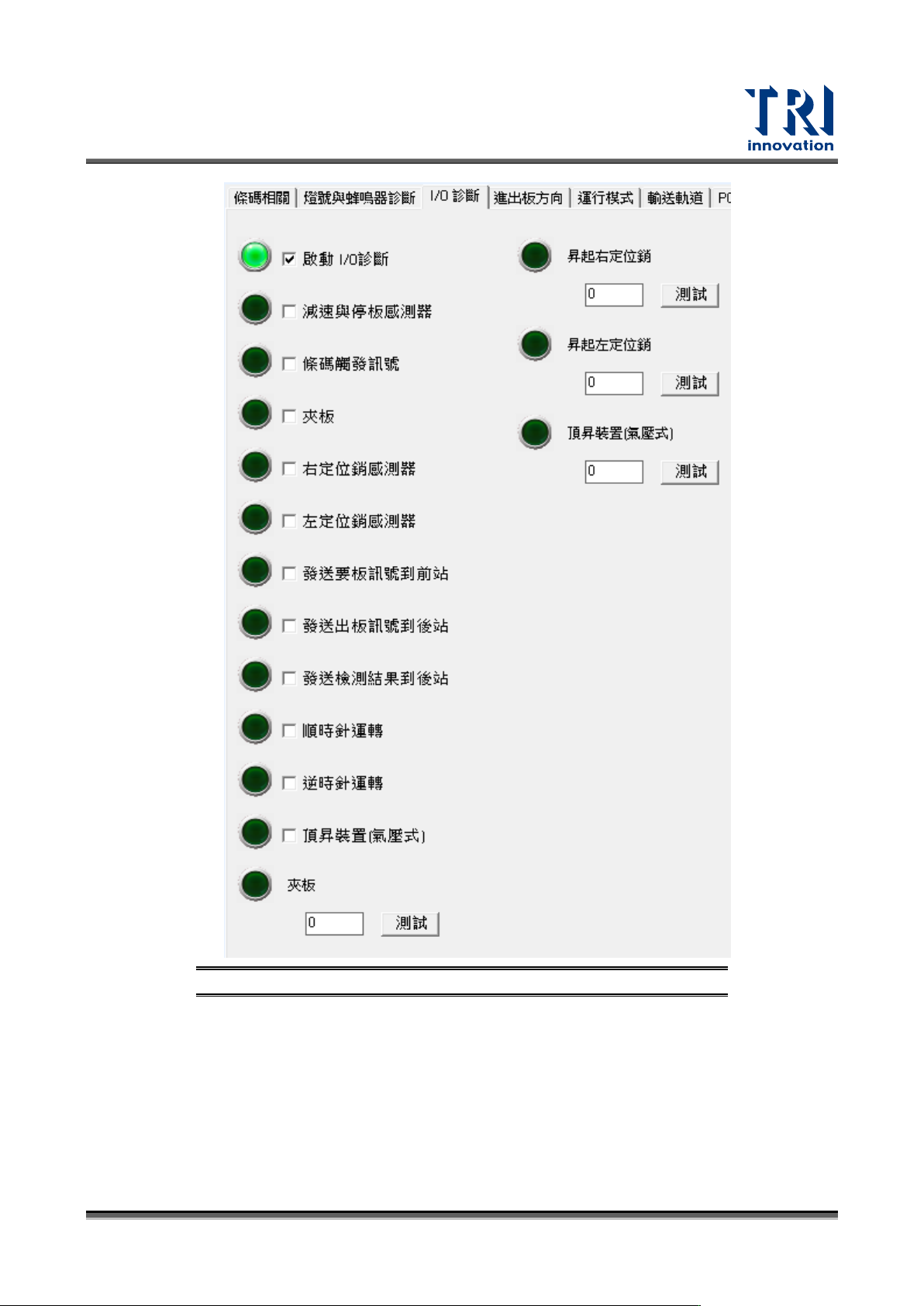Test Research, Inc. TR7700 SIII Series Us er Guide – Software 163 圖 256 : I/O 診 斷介面 減速與停板感測器:測 試減速與停板感測器電源 是否正常顯 示,打勾時感 測器會亮綠 燈。 條碼觸發訊號:手動下 觸發訊號讓硬體條碼器打 光取像。 夾板:測試夾板是否正 常。 右定位銷感測器:測試 右邊位銷感測器動作是否正 常。 左定位銷感測器:測試 左…