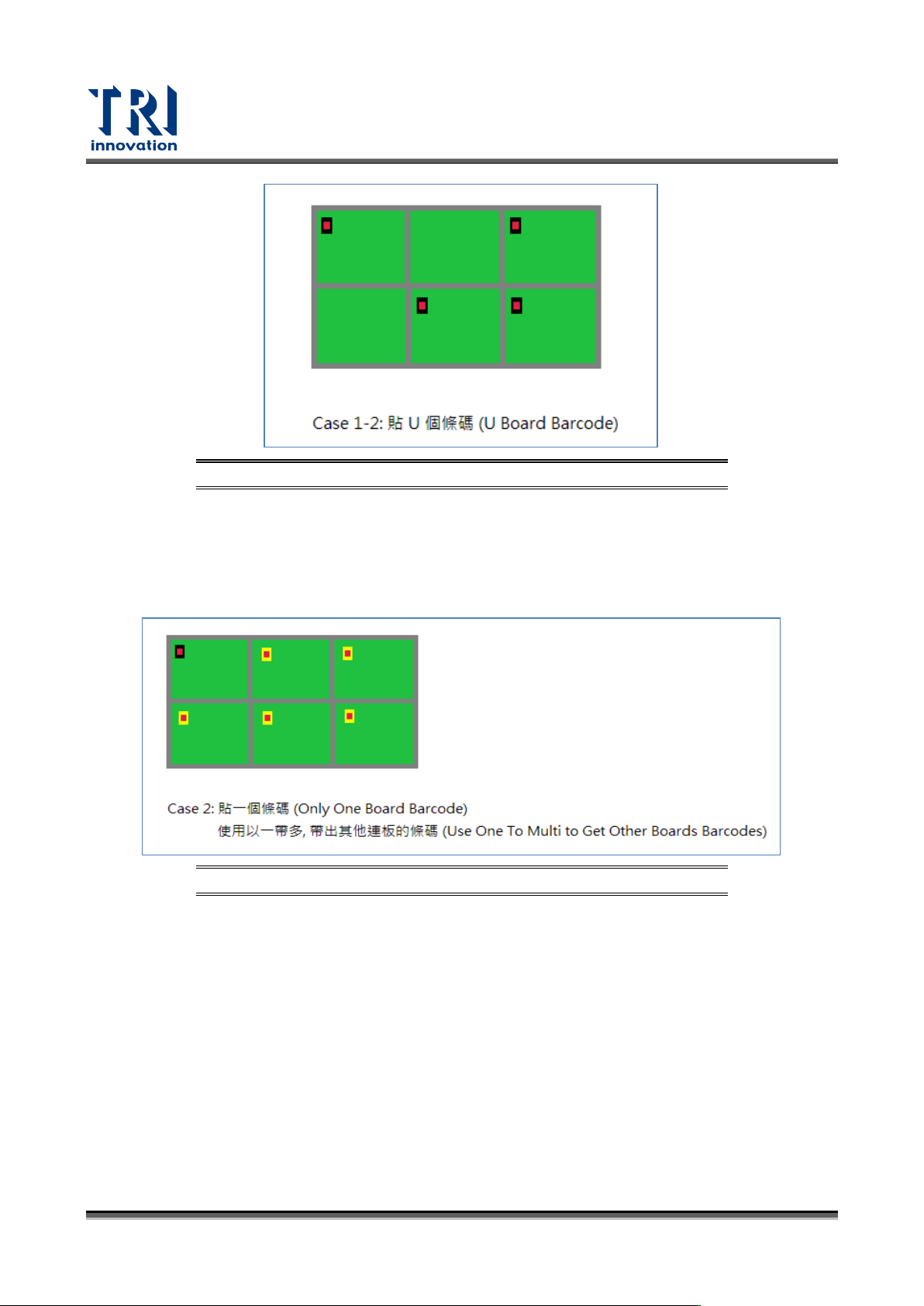 Test Research, Inc. TR7700 SIII Series Us er Guide – Software 175 Case 1 :多連板 (M xN) ,貼一個條 碼; 建立檢測框時 , 框的排板方式要選 擇 Board(Sin g le) ,各小板都會帶出相 同條碼。 圖 275 :條碼應用 — 多連板 Case 1 Case 1-1 :多連板 (M xN) ,貼多個條碼; 建立檢測框時 , 框的排板方式要選…