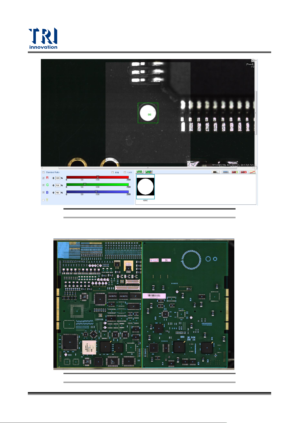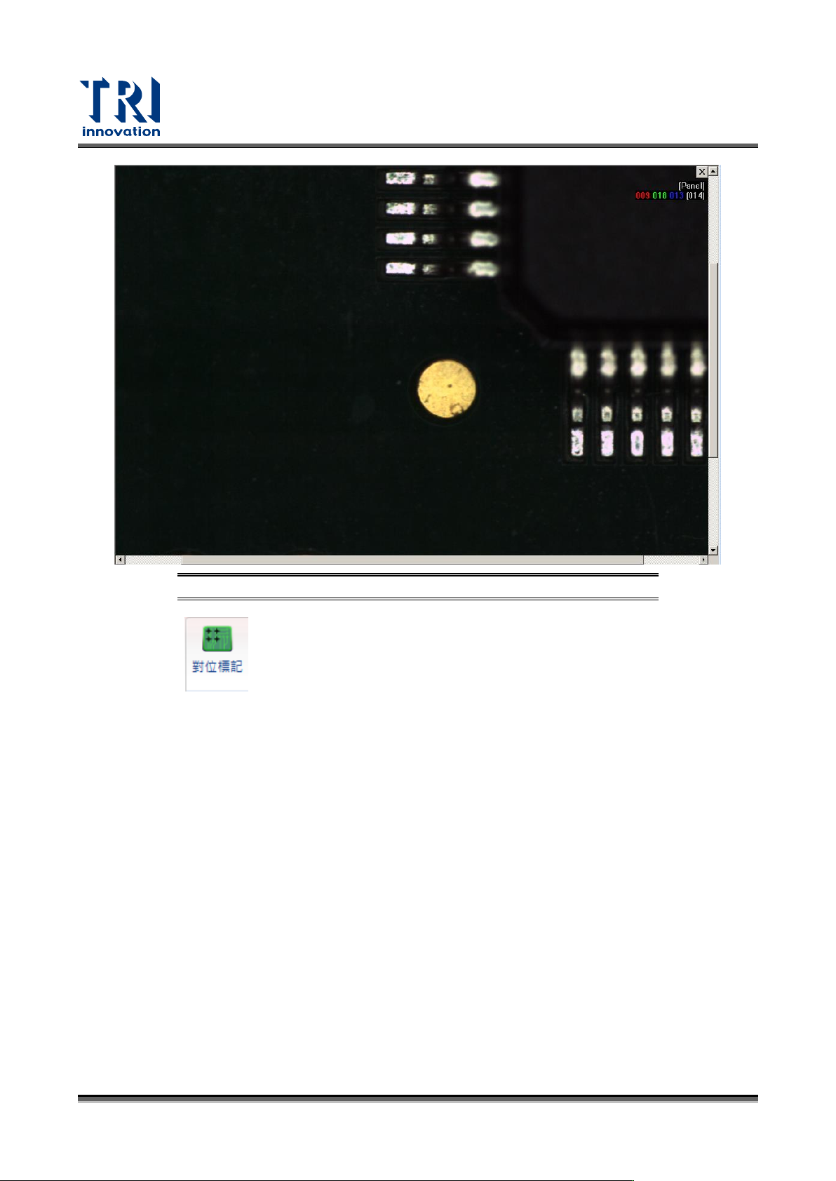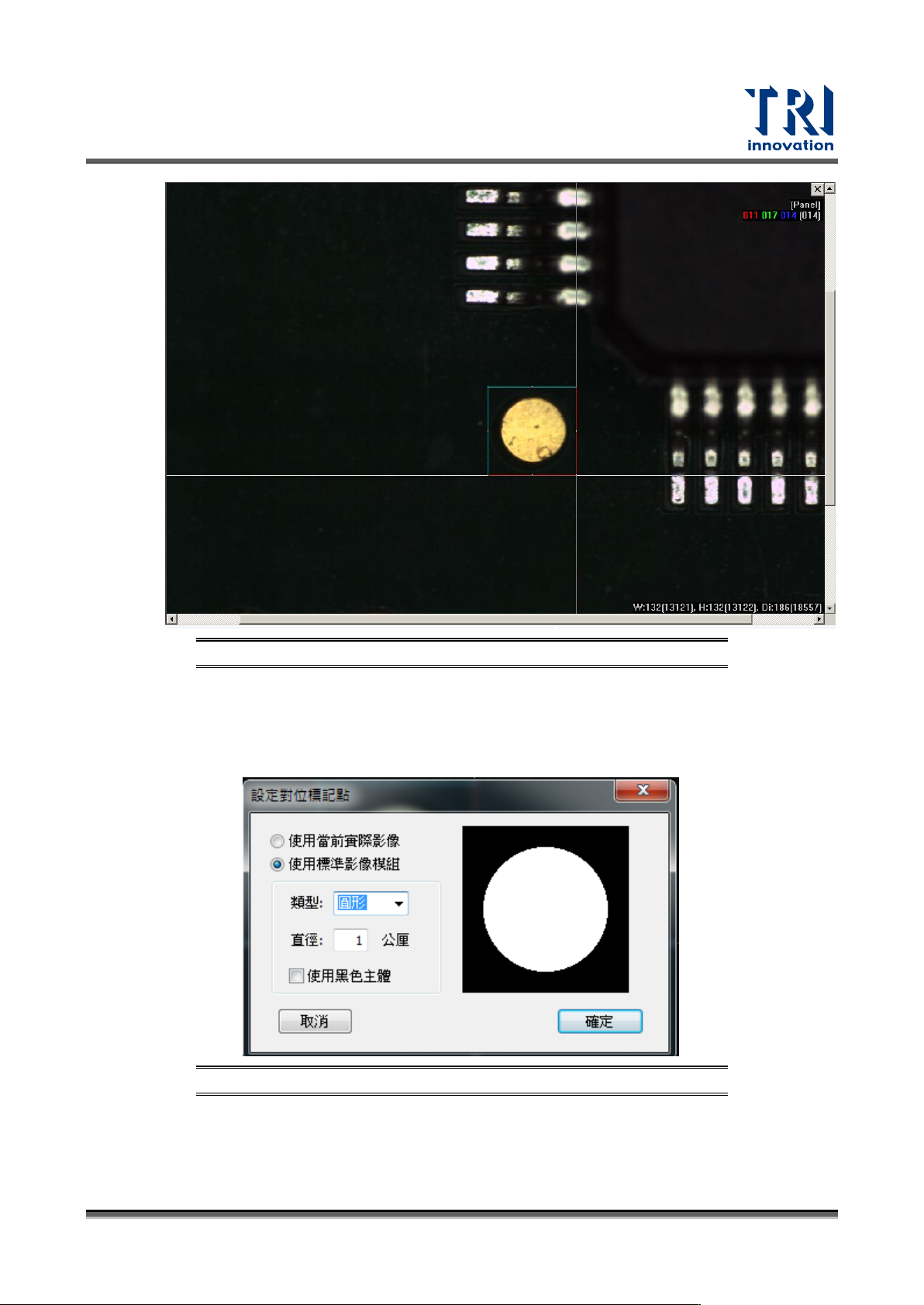 Test Research, Inc. TR7700 SIII Series Us er Guide – Software 29 圖 36 :設定定位座 標 – 步驟 2 4) 選擇 “ 使用當前實 際影像 ” 或 “ 使用標準類型模組 ” 後按下 “OK” 。 使用當前實際影像:直 接擷取檢測框內影像當定位 影像 。 使用標準類型模組:自 動計算圓或方的影像尺寸, 並提供 ” 使用黑色主體 ” 功能切換黑色底或白色 底的設定。…