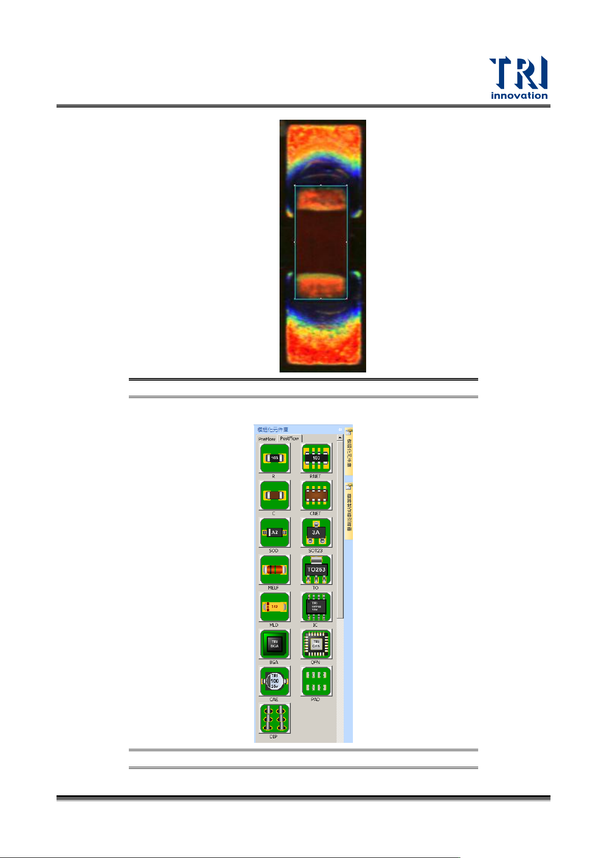 Test Research, Inc. 32 TR7700 SIII Series User G uide – Software 3.2 製作元件資 料庫 在資料庫編輯介面下, 使用者主要有兩種方式來 產生元件所 需的檢測框。 一種是直接 套用模組 化資料庫 ( 初學者建議 使用 ) ,一種是以手動方式 一個一個增加檢 測框。我 們將分別說明如 下: 套用模組化資料庫: 1) 直接在元件清單顯示區 點選想要製作檢測框的元 件上按兩下…