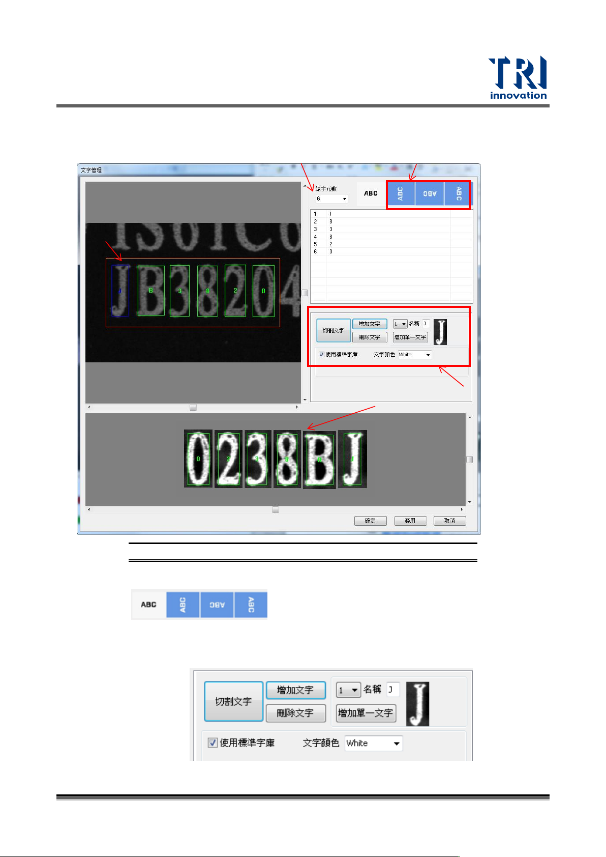 Test Research, Inc. TR7700 SIII Series Us er Guide – Software 69 圖 104 : Font M anager 介面 總字元數 :設定檢測 框內字串的 字元總數。 :設定字串的方向性 ,以使用者 直接看到的方 向來定 義即可。 文法設定區:設定可容 許的字元, " * " 代 表都可以允收。 已設定的字型:切割完 的字型顯示區。 輸入代測字…