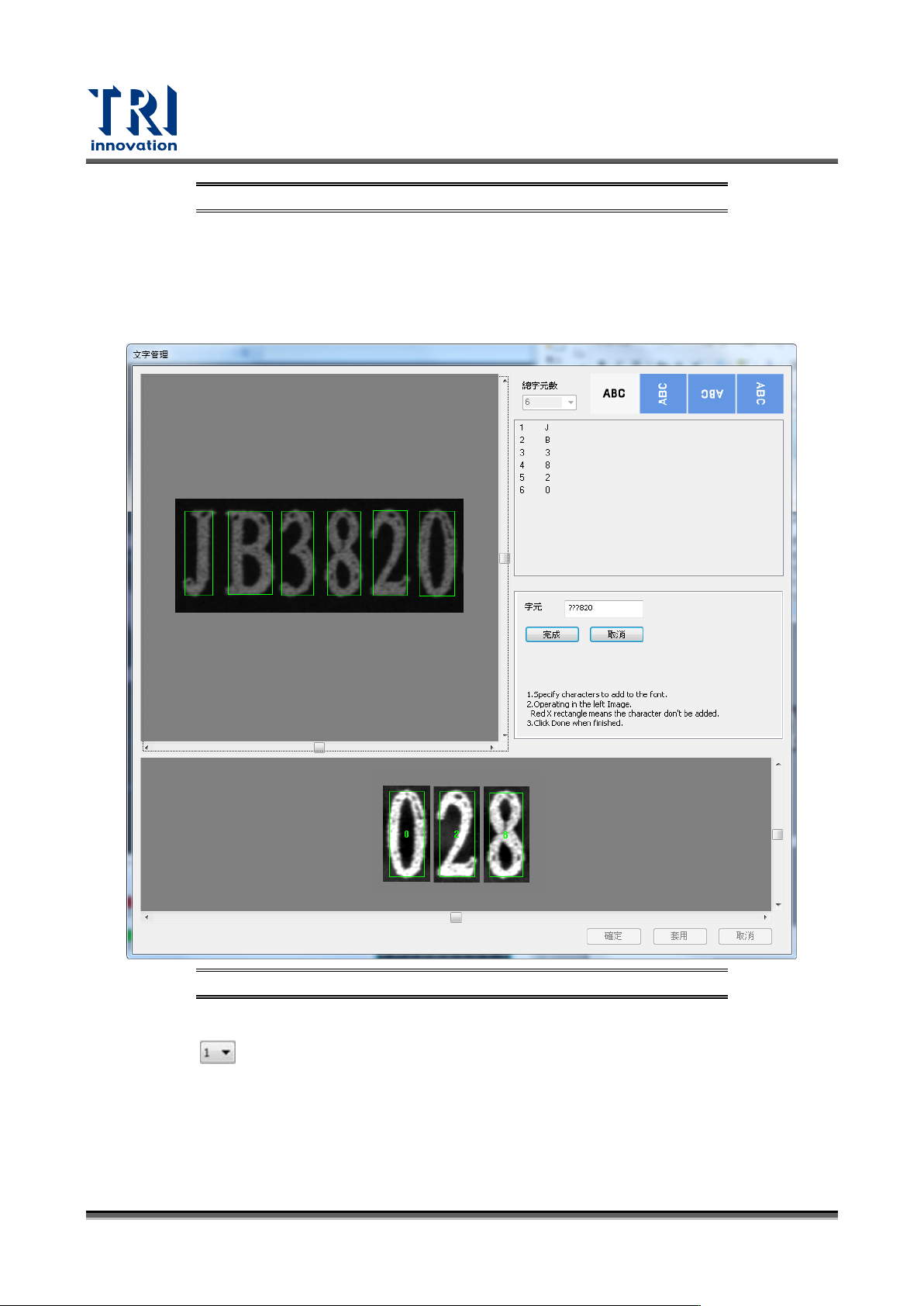 1. 字元:設定手動切割多個字元。???820 表示僅切割後三碼 820 進字型庫。