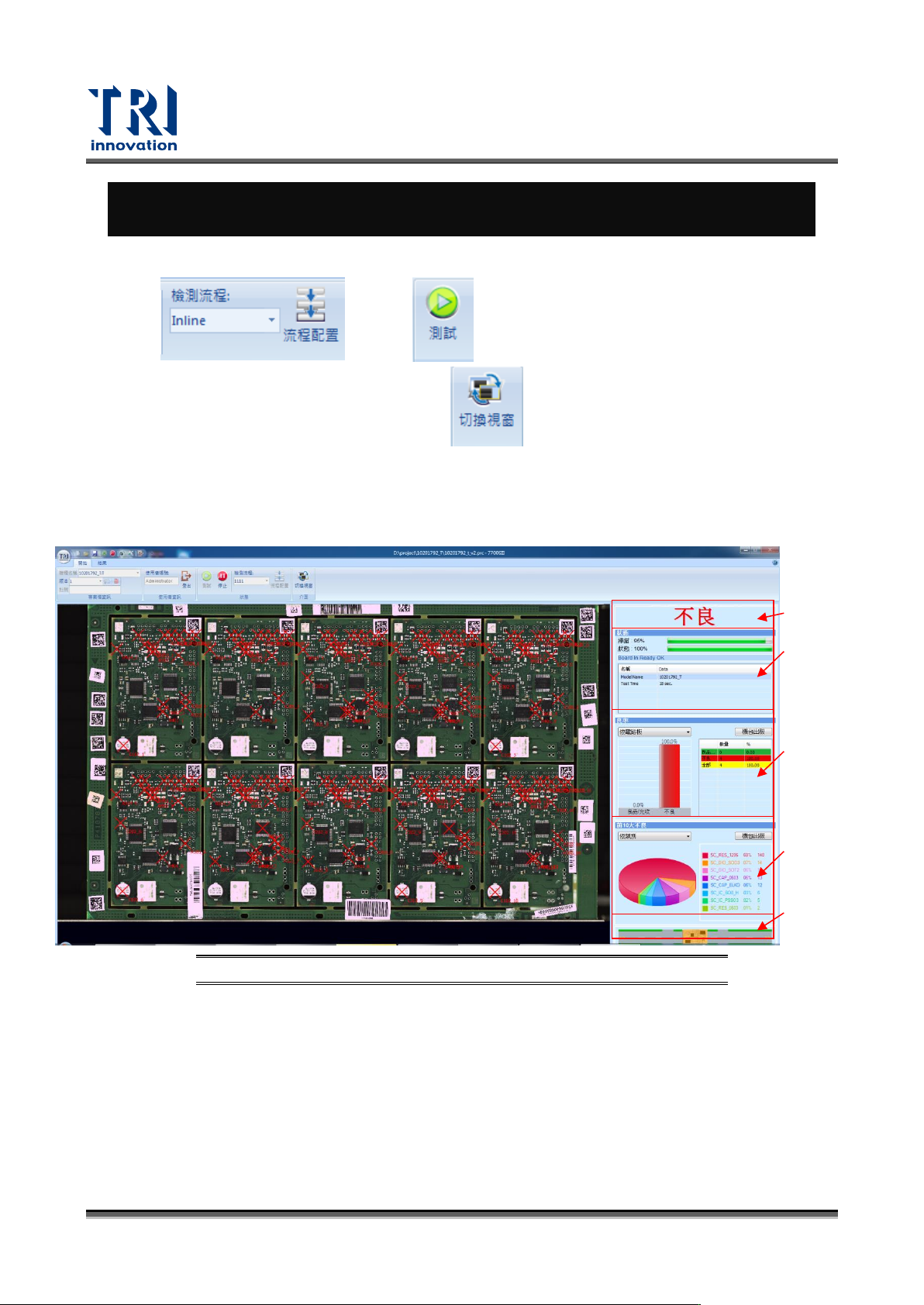 不良元件資訊區:前十大不良分析可依據類型及元件來顯示,並提供圓餅圖及詳細數