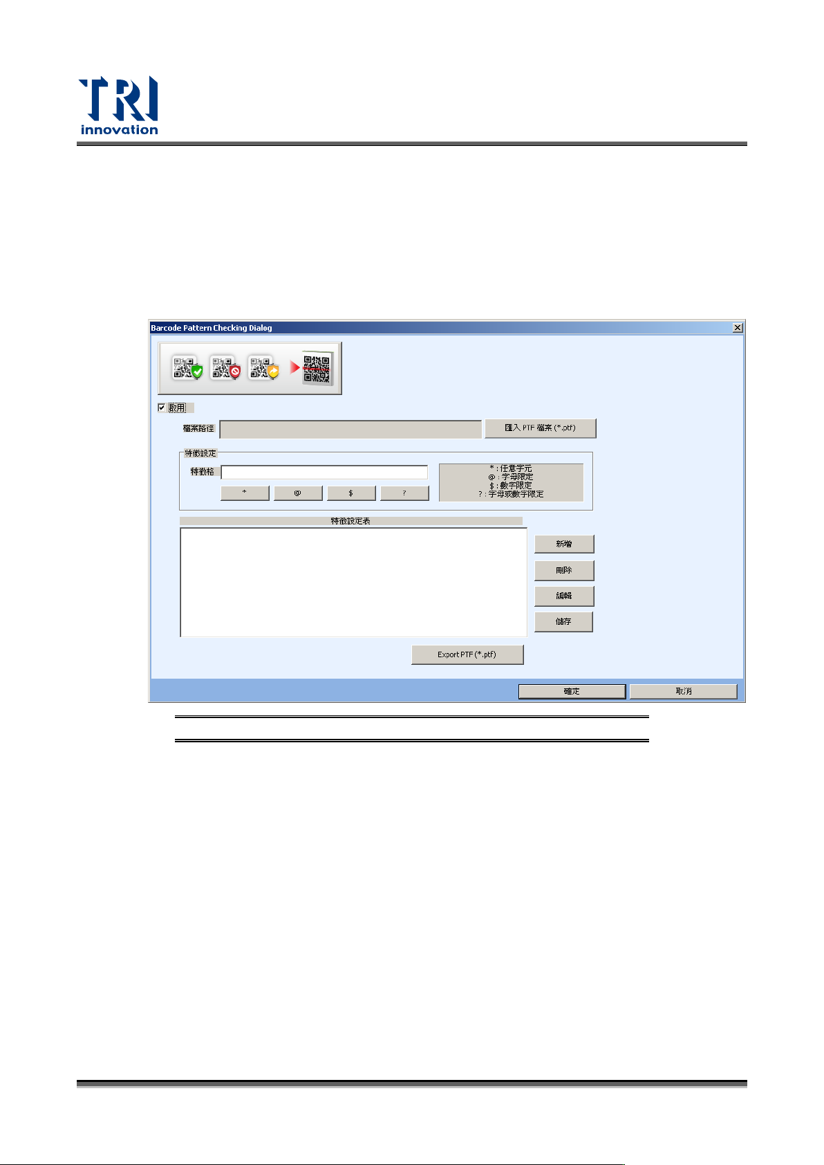 Test Research, Inc. 130 TR7700 SIII Series User G uide – Soft ware − 啟用:開啟標記 生成器功能。 − 分隔字元 :用來區分條 碼間隔,可 能為 - 、 @ 、 _ 、 / …等。 − 展示區: 可測試設定結 果。 特徵比對:客戶提供一個 比對格式,來判斷機台讀 到的條碼是否可以接受 。例 如 :格式為 AA12345 ,機台讀出 來的英文字母僅可以為 AA ,如讀…