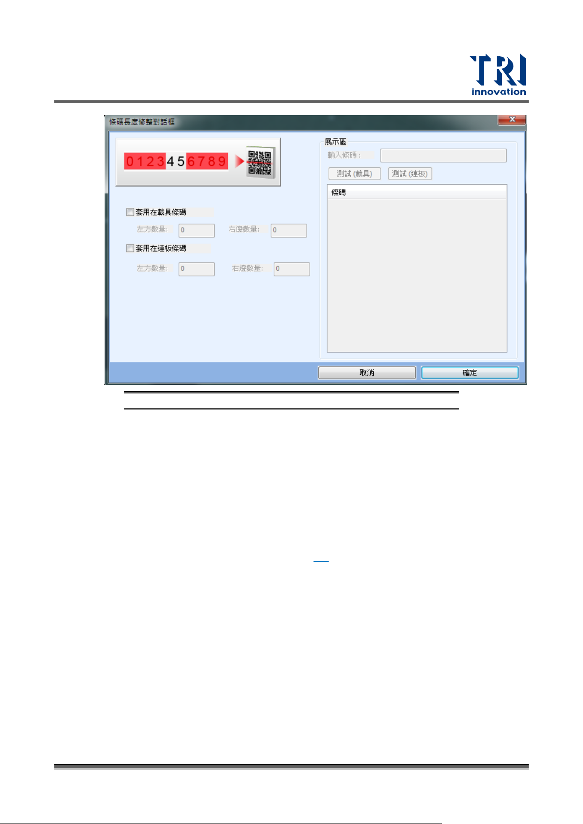 − 套用在連板條碼:設定連板條碼移除左/右字元數;