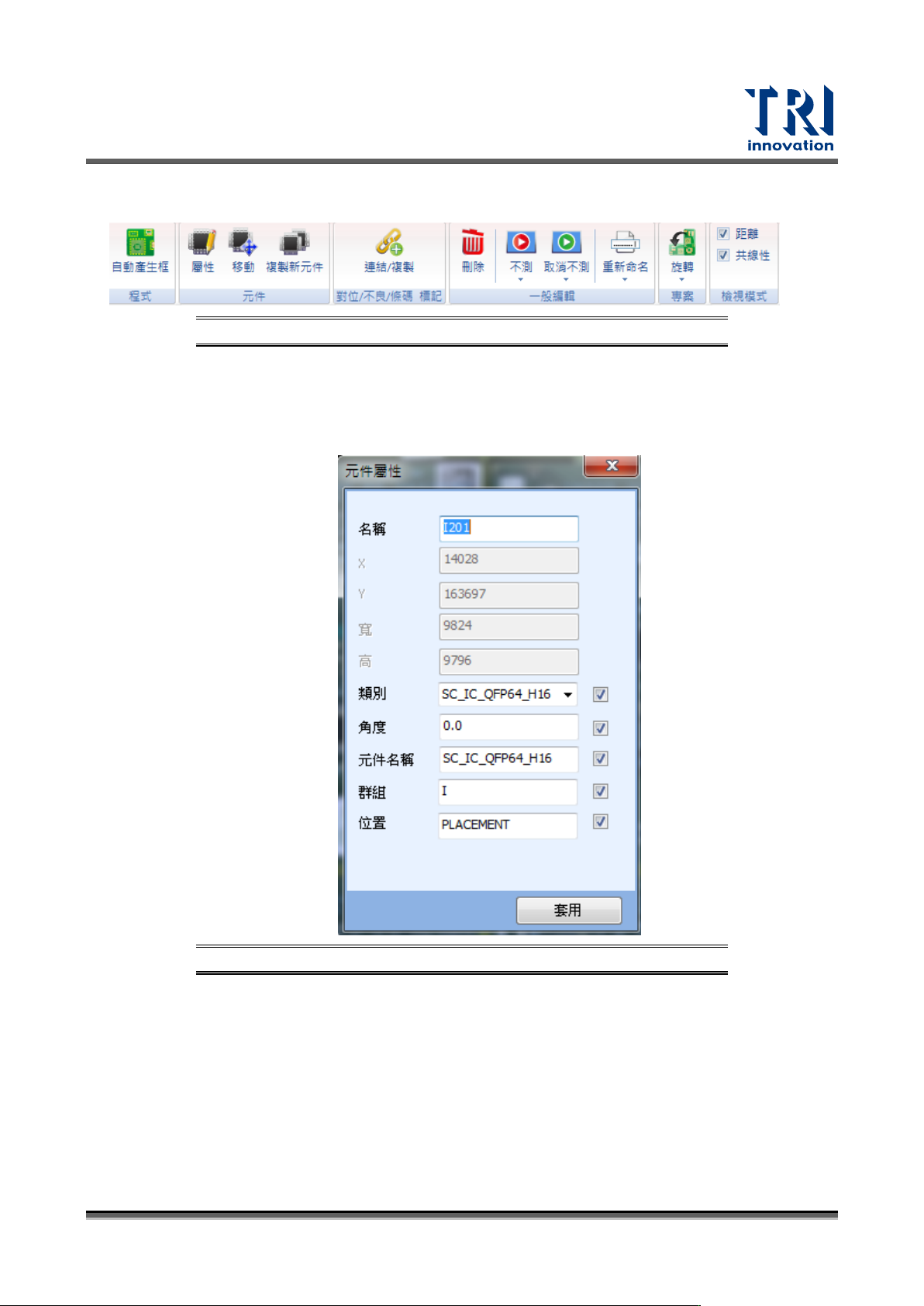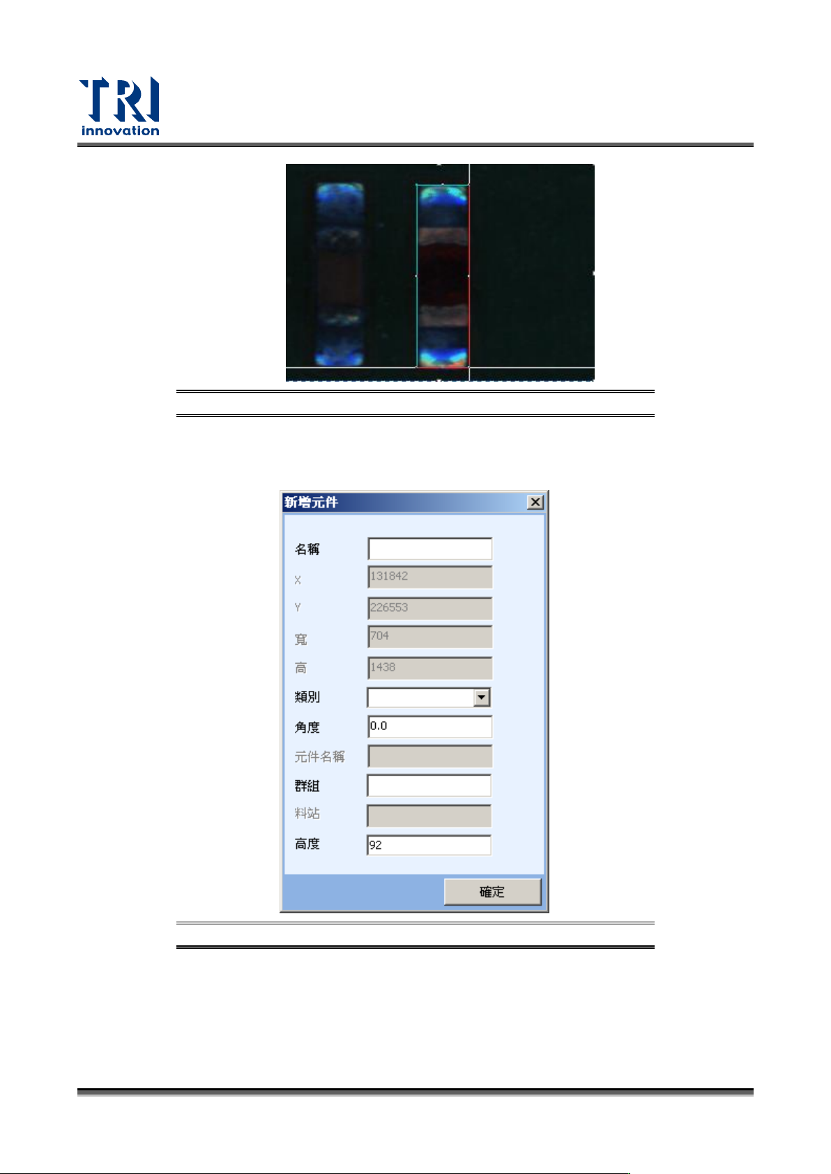 Test Research, Inc. 132 TR7700 SIII Series User G uide – Soft ware 圖 197 :拖曳元件 位置 設定完新增元件的位置 後,會跳出以下視窗。依 序設定此元 件的名稱、類 別、角度和 群組後, 按下 [ 確定 ] 來增加 此元件 CAD 座標。 圖 198 :元件編輯 視窗