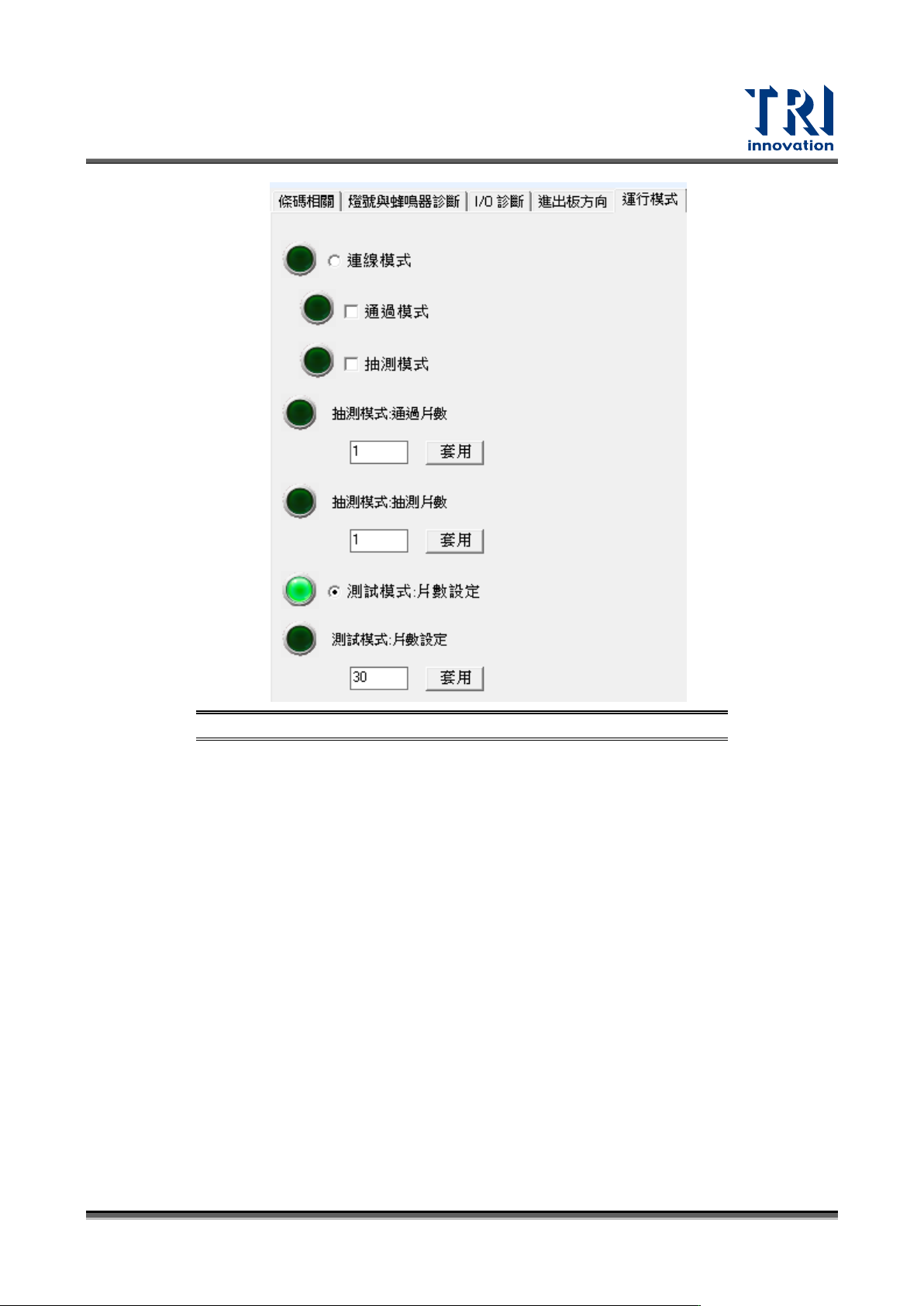 連線模式:一般生產模式,可增加設定通過模式及抽測模式。