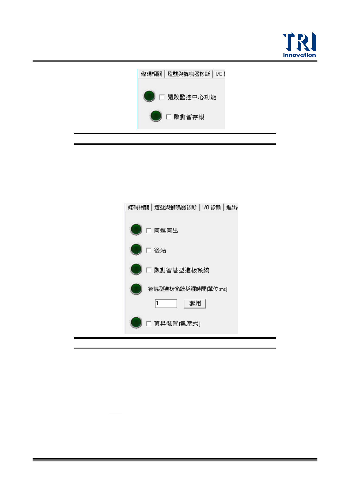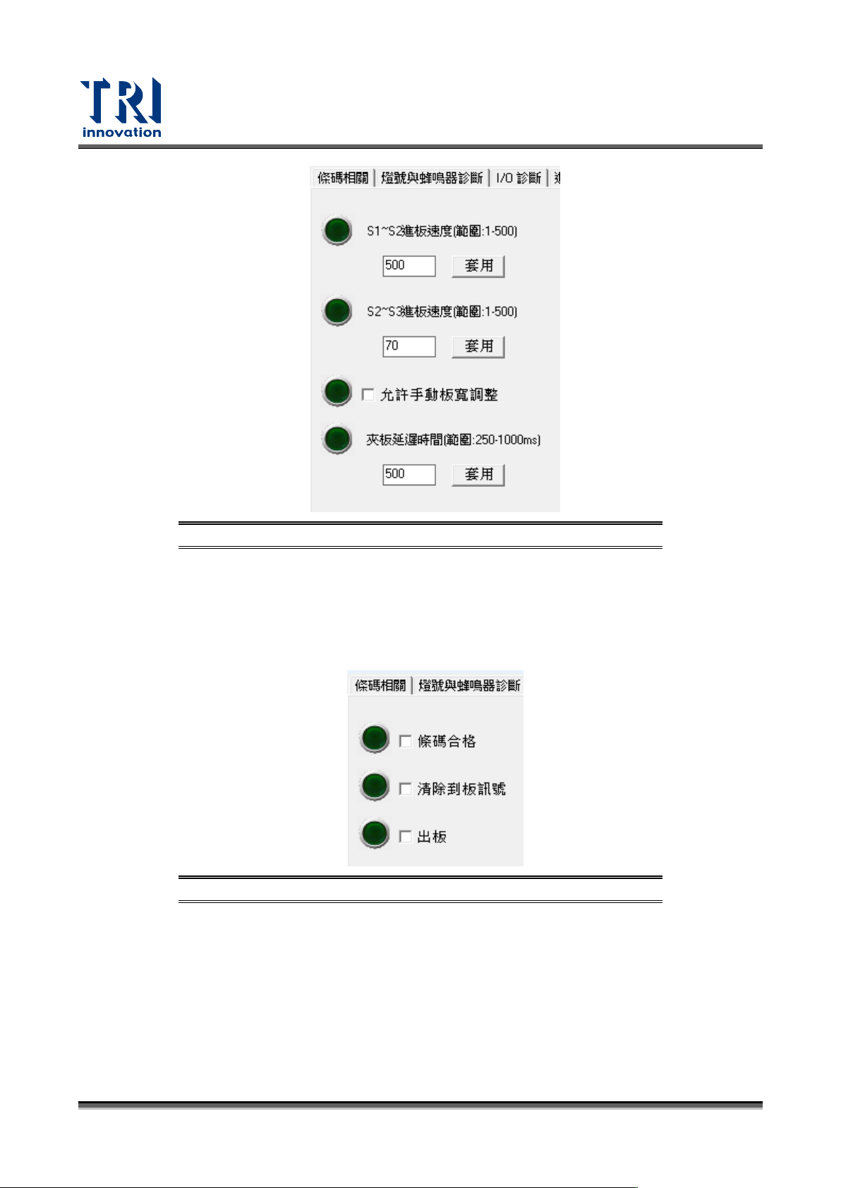 Test Research, Inc. 166 TR7700 SIII Series User G uide – Soft ware 圖 259 :輸送軌道 介面 進板速度 (S1~S2) :設定 進板到減速感測器的速度 。 進板速度 (S2~S3) :設定 減速到夾板感測器的速度 。 手動板寬調整:此機台 預設為自動板寬,如須手 動調整則需 將此功能開啟 。 夾板延遲時間:機板到 定位後夾板的延遲時間。 PLC 頁…