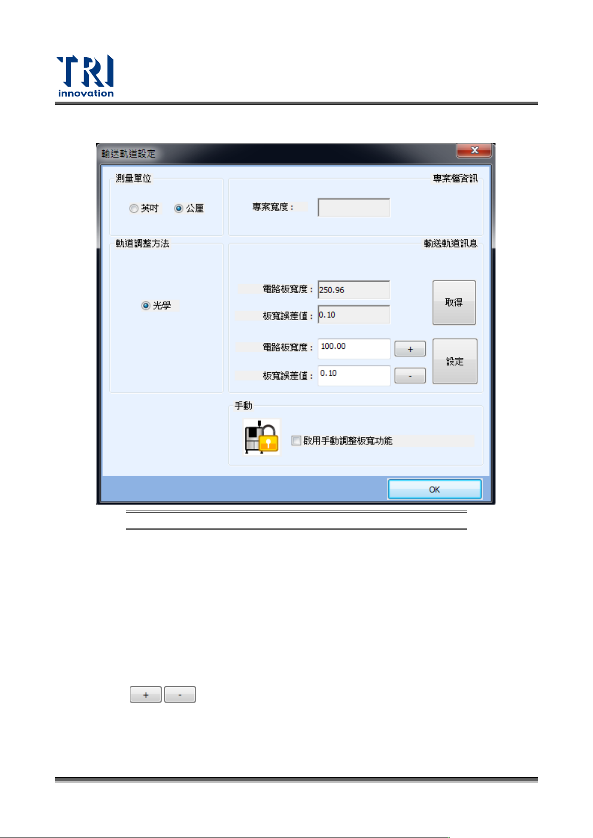 Test Research, Inc. 168 TR7700 SIII Series User G uide – Soft ware 6.1.2 調整板寬 圖 263 :板寬設定 測量單位:設定單位為 英吋或公厘。 專案資訊:專案寬度為 儲存在專案內的板寬資訊。 軌道調整方法: − 光學:利用軌道上預先 製作的光學點,利用光學 頭移動去向 可計算出目前 軌道寬 度值,不需要將軌道復 歸至原點再調整至所設定 寬度,可節 省軌道…