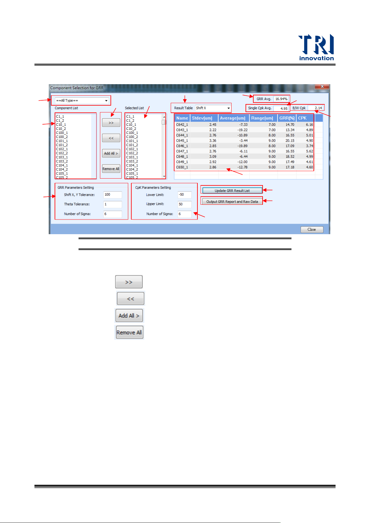Test Research, Inc. 180 TR7700 SIII Series User G uide – Soft ware 6.3 GRR/Cpk 功能 對於用 GRR 值判斷一致性的建議參考標 準為: GRR<10% :相當優良 ; 10%<GRR<30% :可接受; GRR>30% :無法 接受,需要校正 。 − Step1 :先在流程配置 G eneral Settin g 選擇方向 -- 左…