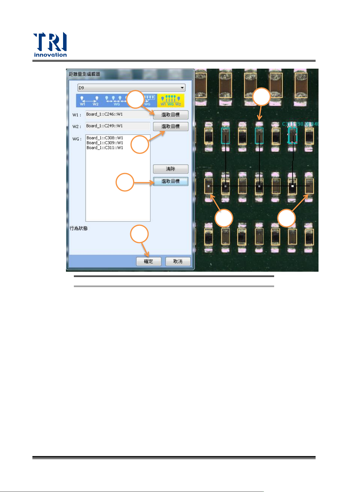 Test Research, Inc. TR7700 SIII Series Us er Guide – Software 193 圖 303 :距離量測 - 單一個 檢測框到 多個檢測框 設定步驟 − 使用方式 1) 在大圖模式或者 原圖模式 上選擇一個檢測 框。 2) 點選 [ 距離編輯器 ] 中W 1 欄位的 [ 選取目標 ] ,此時所選取的 檢測框會被套到欄位 裡。 3) 在大圖模式或者 原圖模式 上再選擇另外多個檢測 框。 4…