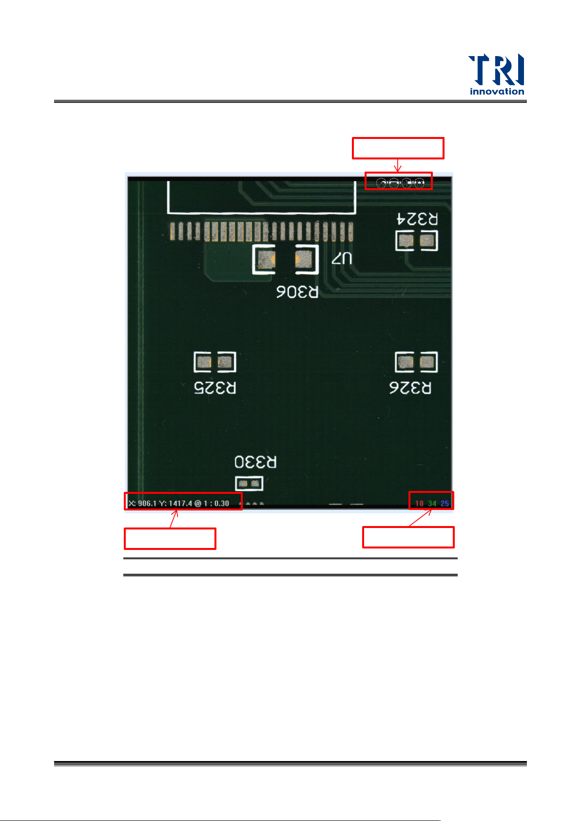 Test Research, Inc. TR7700 SIII Series Us er Guide – Software 201 圖 311 :影像顯示 區 鏡頭移動控制器:點選指 定的方向後會依 照設定的 數值進行步進動作。 比例尺與座標 三原色灰階 顯示功能按鈕