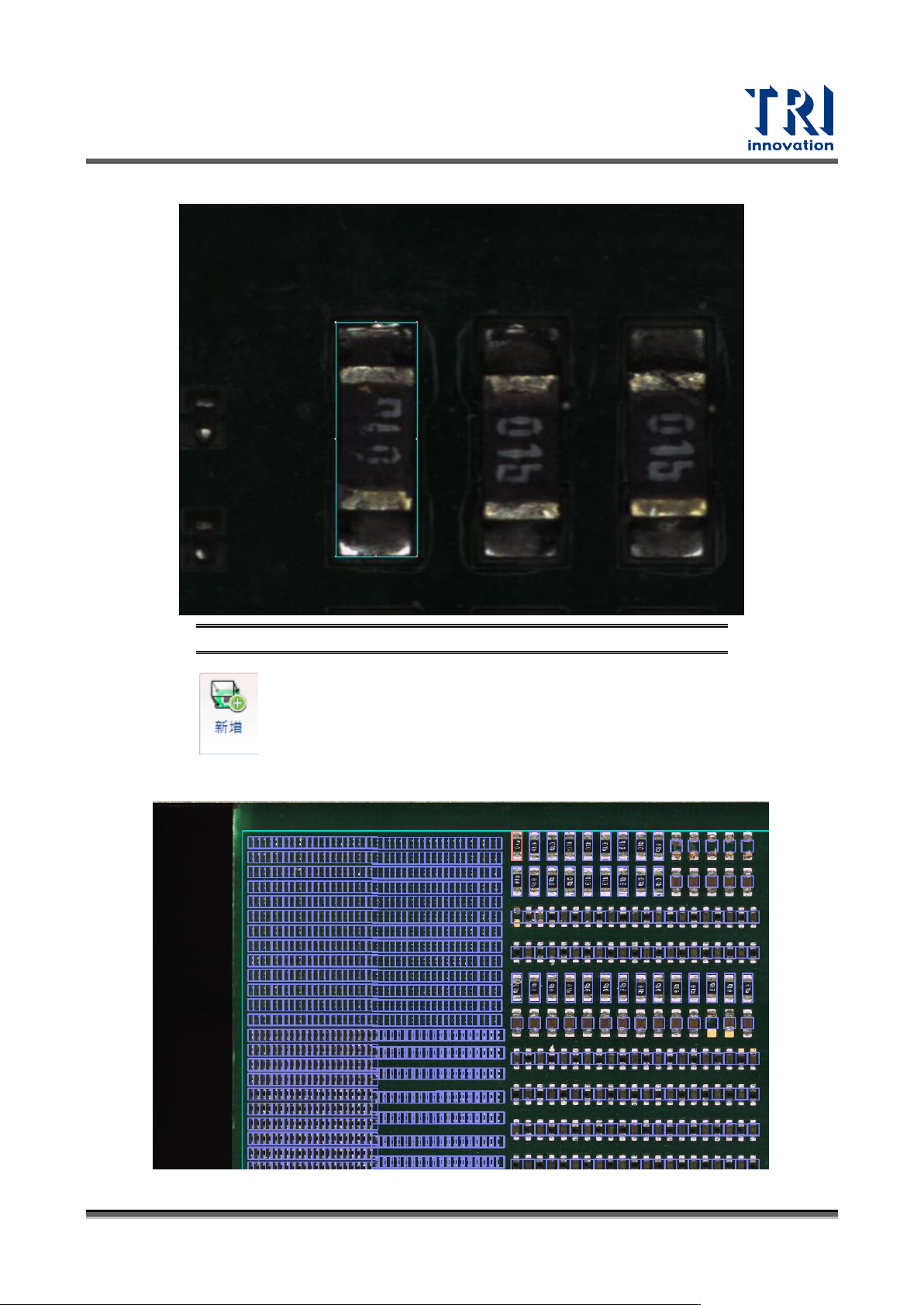 Test Research, Inc. TR7700 SIII Series Us er Guide – Software 19 4) 調整 CAD 方格大小至切齊元件 焊盤 邊緣。 圖 22 :增加參考座 標 – 步驟 3 5) 點選 來加入第一個參考座 標點 ( 或者直接左鍵點 選 CAD 方格兩下 ) 。 接著,系統 會自動切換回 大圖 模式,並且將設 為參考座標的元件以橘色 顯示。