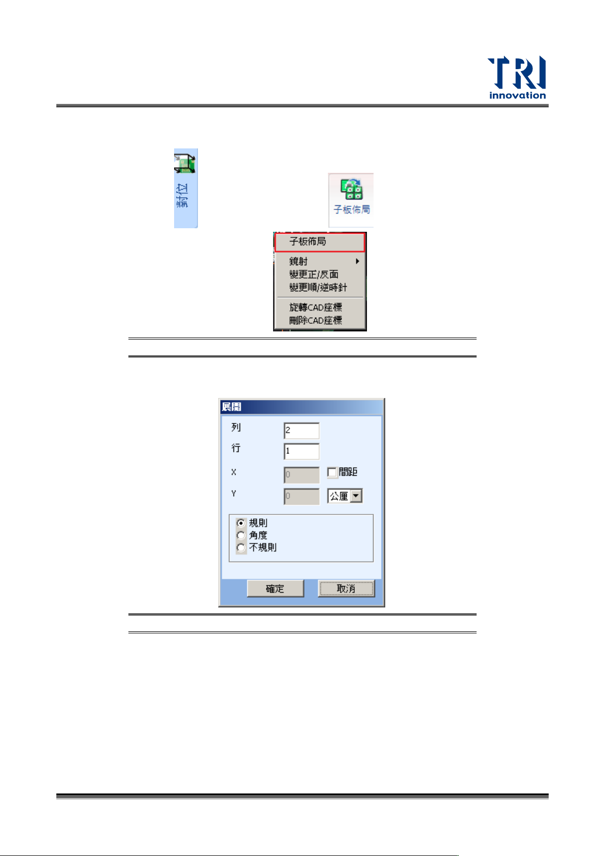 Test Research, Inc. TR7700 SIII Series Us er Guide – Software 21 2.6 產生多板資 訊 1) 在 [ 對位 ] 頁籤 ( ) 下,選擇第一子板 後按下 或者按右鍵後選擇 [ 子 板佈局 ] 。 圖 25 :產生多連 板資訊 – 步驟 1 2) 輸入想要的連板數量或 直接輸入小板間距與其排 列方式後, 按下 “ 確定 ” 。 ( 以此範例來 說,我們選擇不規則 2 x1 的…