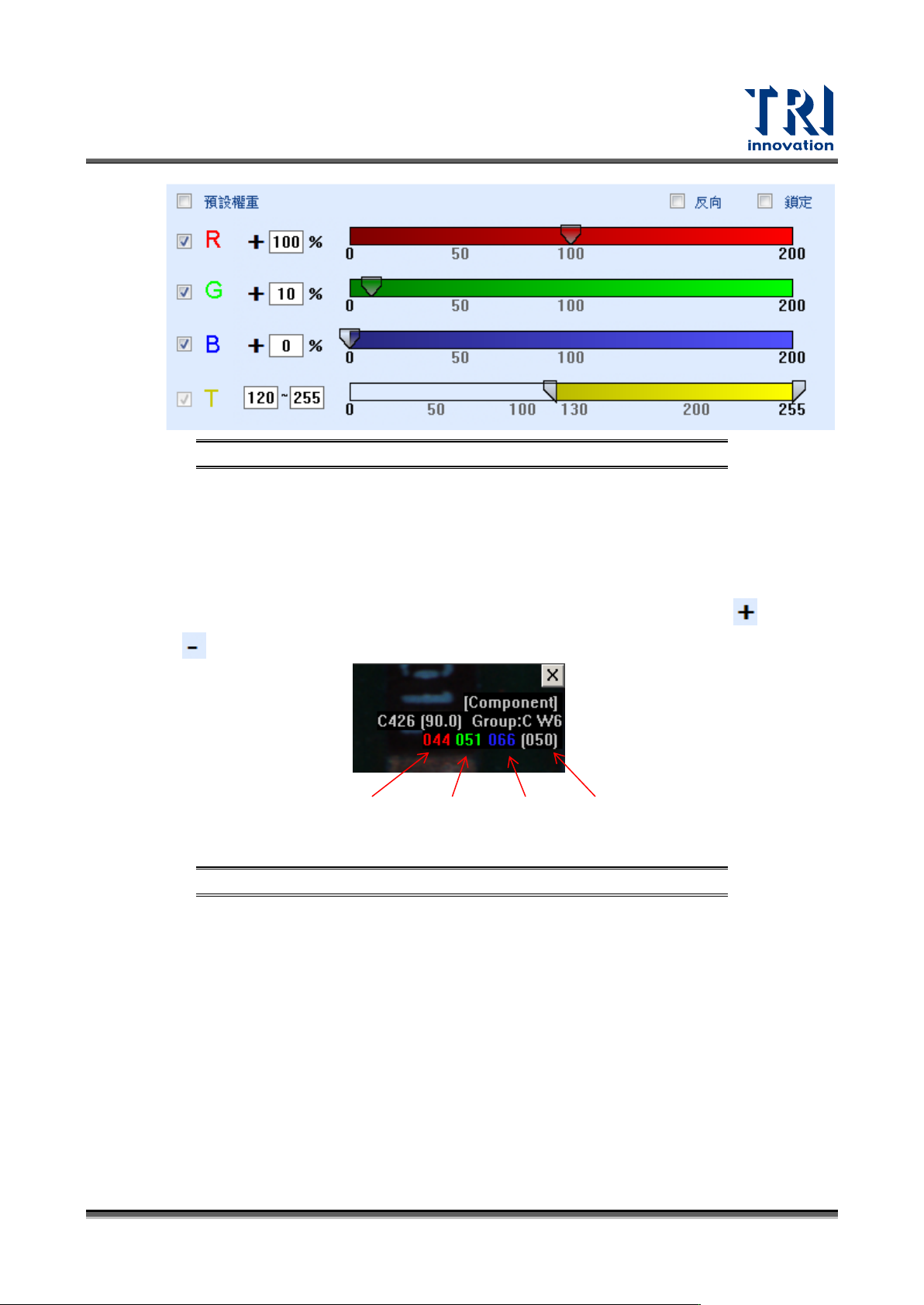 Test Research, Inc. 42 TR7700 SIII Series User G uide – Software 圖 58 :白燈 3.4 代料影像處 理方式 新增加到代料顯示 / 編 輯區的影像 ,可以藉由三 種方式來進行影像 處理動作:權重法 ( 權重法 ) 與 色彩空間法 (Color Space) 和 RGB 法。使用者藉由 [ 檢測框參數設 定面板 ] 中 [ 演算法參數與其 相 對應的合格標準 ] 的 [ 影…