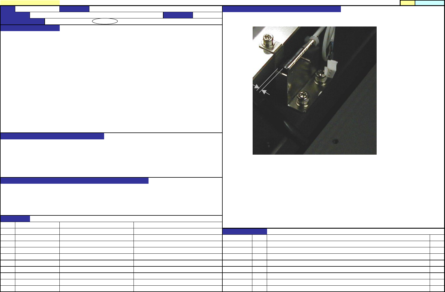 QA 表 NO. 机种 1.把传感器配件和传感器的间隙(下图)调整成规格值。 1.安装在BU台上的传感器配件和BU原点传感器的间隙(Y方向)为 1mm 1.确实地检测原点 1.BU台原点复位时,不能检测原点,BU台超过最下点(机械止动器)。 NO ① ② NO. 担当人 ③ ④ ⑤ ⑥ ⑦ ⑧ ⑨ ⑩ 【8】-20 内容 E4115729000 BU传感器配件 日期 E4114729000 BU传感器架 变更履历 货号 品名 有关质量特…