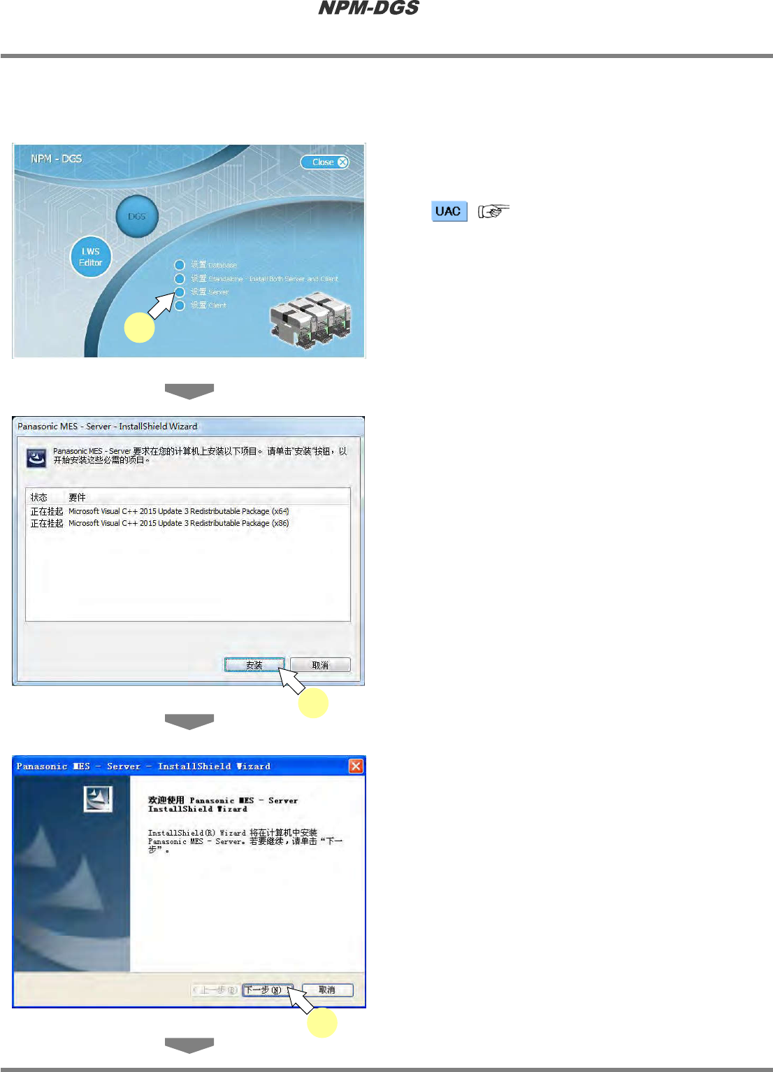 程序手册 2.1NPM-DG S 的安装 Page2-66 EJS9AC-MB-02P -22 n 分别安装 DGS 客户端、数据 库,服务器的 功能时 ① 安装服务器时 1 在放入 CD-ROM 后自动再生的画面上 选择 ‘ 设置 Server’ 。 * ( ‘ 1.3.1 关于用 户帐户控制 ’) 2 点击 [ …