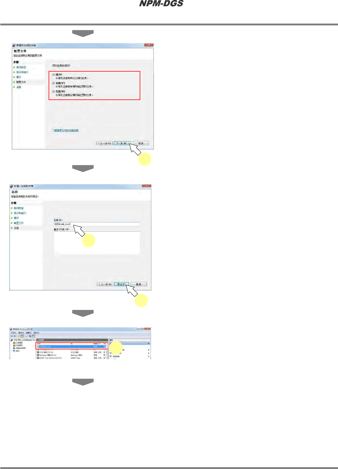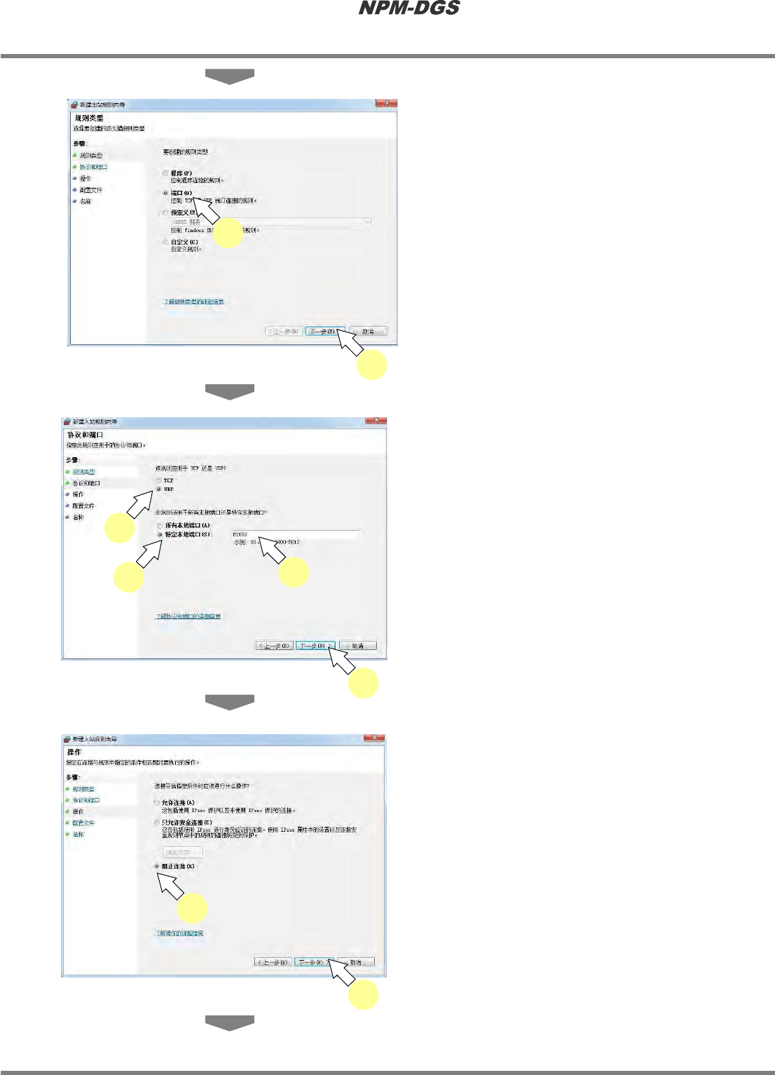 程序手册 2.1NPM-DG S 的安装 EJS9AC-MB-02P -22 Pag e2-83 3 点击 ‘ 端口 ’ 的复选框按钮。 4 点击 [ 下一步 ] 。 5 点击 ‘UDP’ 的复选框按钮。 6 点击 ‘ 特定本地端口 ’ 的复选框按钮。 7 在 ‘ 特定本地端口 ’ 中输入 ‘61000…