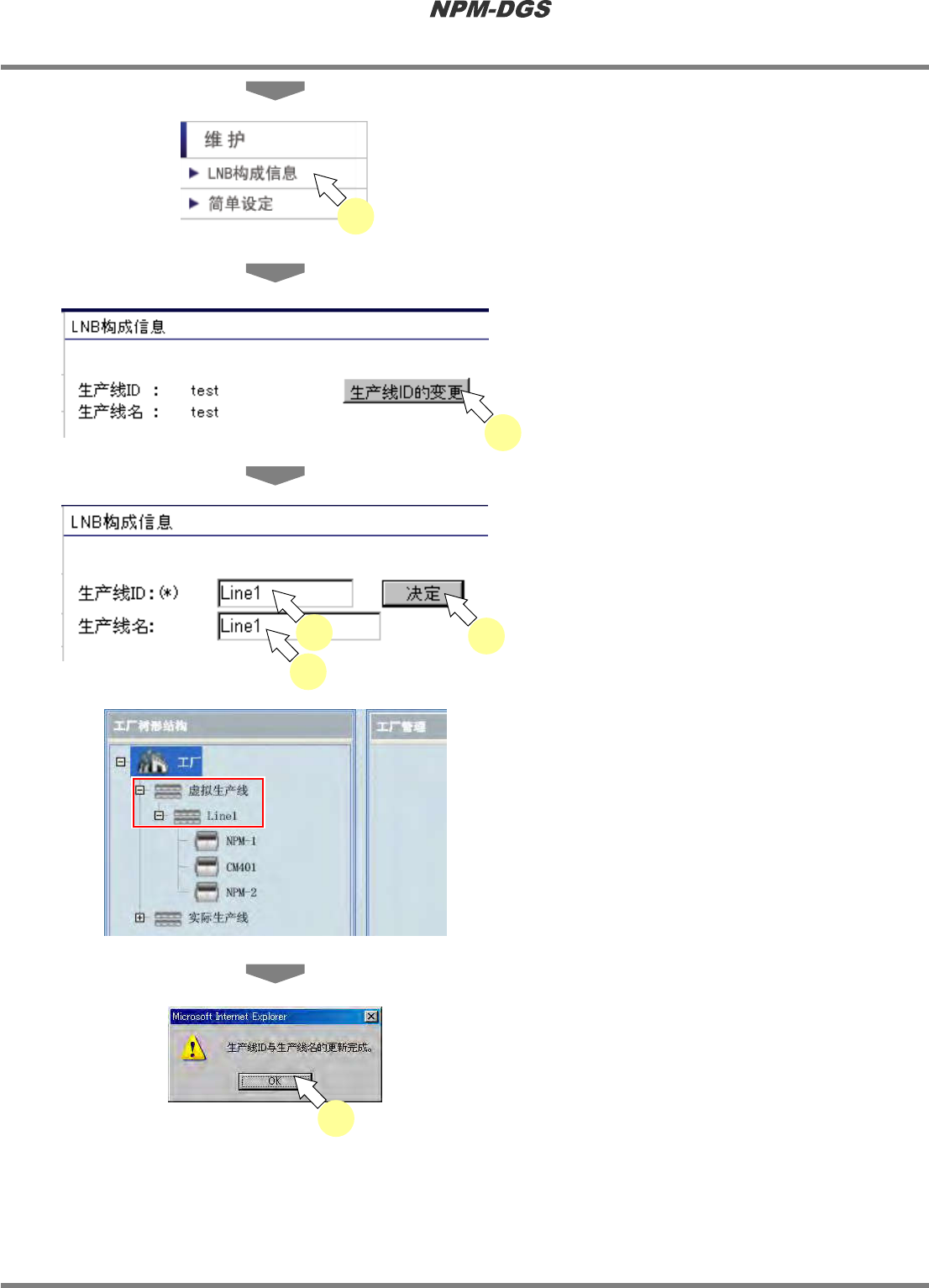 程序手册 2.1NPM-DG S 的安装 EJS9AC-MB-02P -22 Pag e2-97 4 在左側的菜单中选择 [ 维护 ] 下面的 [LNB 构成信息 ] 5 点击 [ 生产线 ID 的变更 ] 。 6 输入 ‘ 生产线 ID’ ,点击 [ 决定 ] 。 * 不输入生产线名 也可。 …