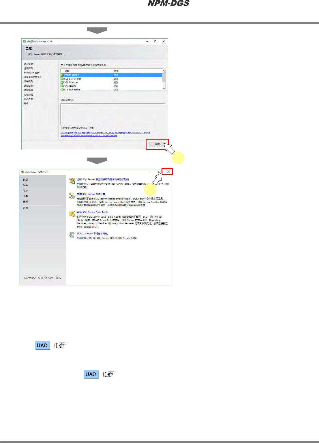 程序手册 2.2DGS 应用程 序的升 级 EJS9AC-MB-02P -22 Page2-117 9 点击 [ 关闭 ] 。 10 关闭 <SQLServer 安装中心 > 画面。 ④ MicrosoftSQLServerMana…