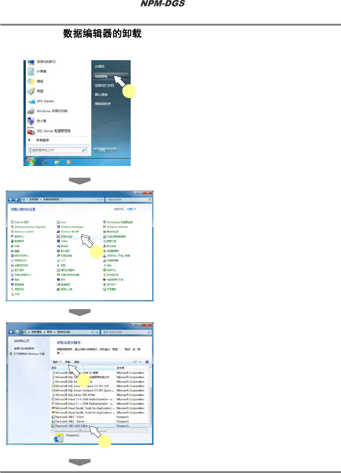 程序手册 2.3DGS 的卸 载 Page2-142 EJS9AC-MB-02P -22 2.3.4 LWS 在此说明 LWS 数据编辑器的卸载方 法。 1 打开 [ 开始 ] ® [ 控制面板 ] 。 · 显示出 < 控制面板 > 画面。 2 双击 ‘ 程序和功能 ’ 。 · 显示出 < 卸载或更改…