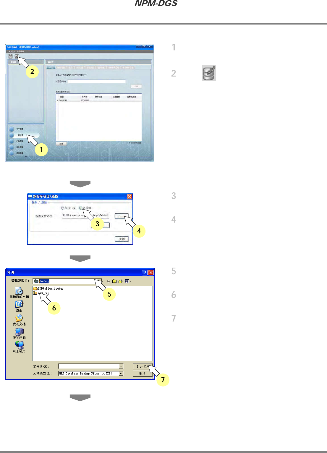 程序手册 3.2 关于环境设定画面 Page3-10 EJS9AC-MB-03P-20 ② 通过 [ 数据库备份 / 还原的启动 ] 进行还原 选择 [ 一般设置 ] 。 点击 。 · 显示出 < 数据备份 / 还原 > 画面。 选择 ‘ 还原源 ’ 。 点击 [...] 。 · …