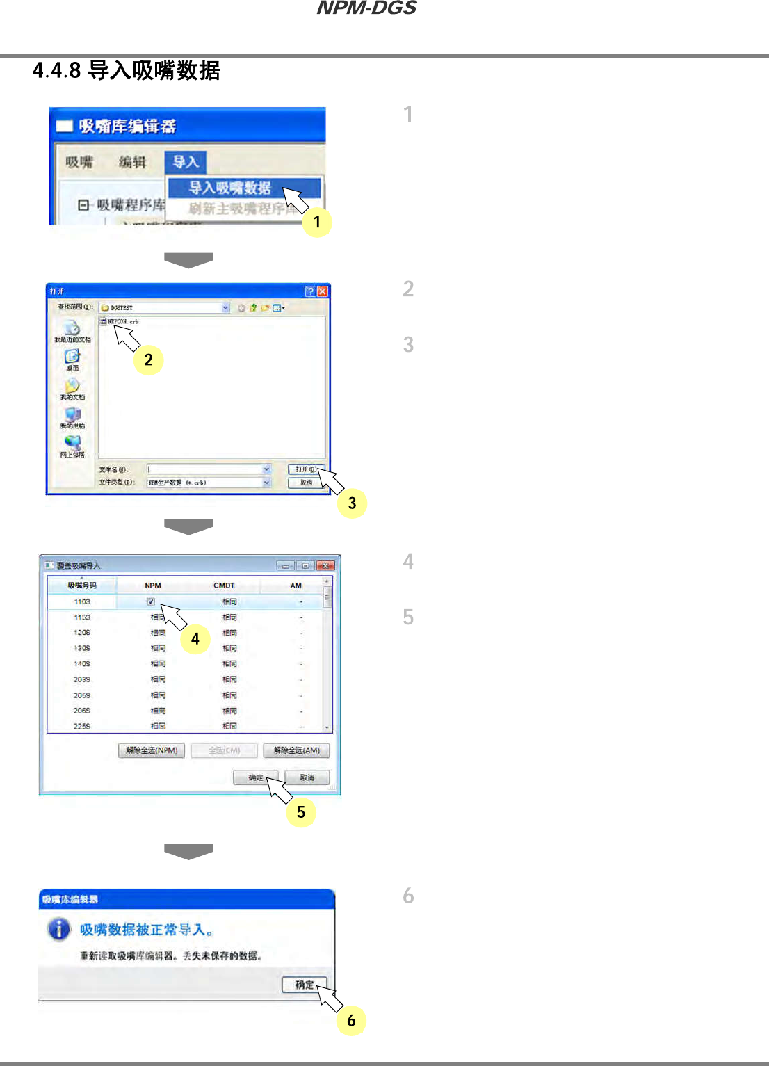 程序手册 4.4 吸嘴程序库编辑器 Page4-84 EJS 9AC-MB-04P- 40 选择菜单栏的 [ 导入 ] ® [ 导入吸嘴数 据 ] 。 · 将显示 < 打开 > 画面。 选择需要导入的生产数据。 点击 [ 打开 ] 。 · 将显示确认画面。 确认覆盖保存导入的吸嘴。 …
