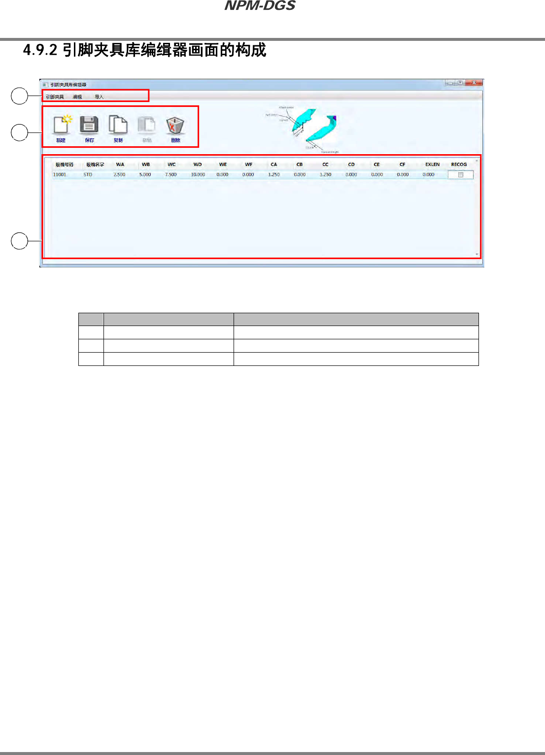 程序手册 4.9 引脚夹具库编辑器 Page4-108 EJS 9AC-MB-04P-40 No. 名称 说明 ① 菜单栏 显示各个菜单。 ② 工具栏 显示各操作项目的图标。 ③ 工具一览显示区域 显示工具数据的详细。 Factory041100S-04C0…