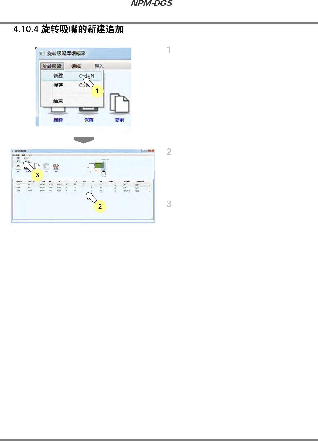 程序手册 4.10 旋转吸嘴库编辑器 Page4-120 EJS 9AC-MB-04P-40 选择菜单栏的 [ 旋转吸嘴 ]→[ 新建 ] 。 输入旋转吸嘴的详细内容。 * 必须设定的详细内容, 由本公司连同旋转吸嘴 一同提供。请将记述内 容输入到追加行的数据 中。 选择菜单栏的 [ 旋转吸嘴 ]→[ 保存 ] 。 …