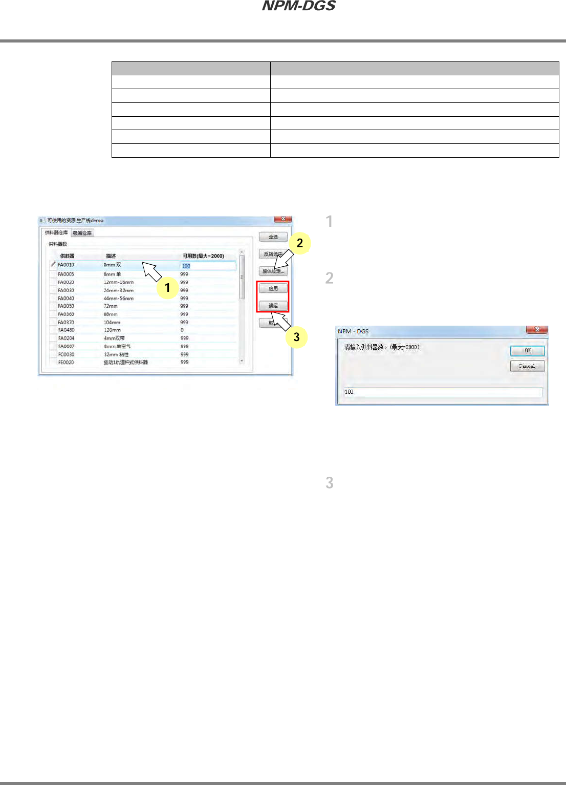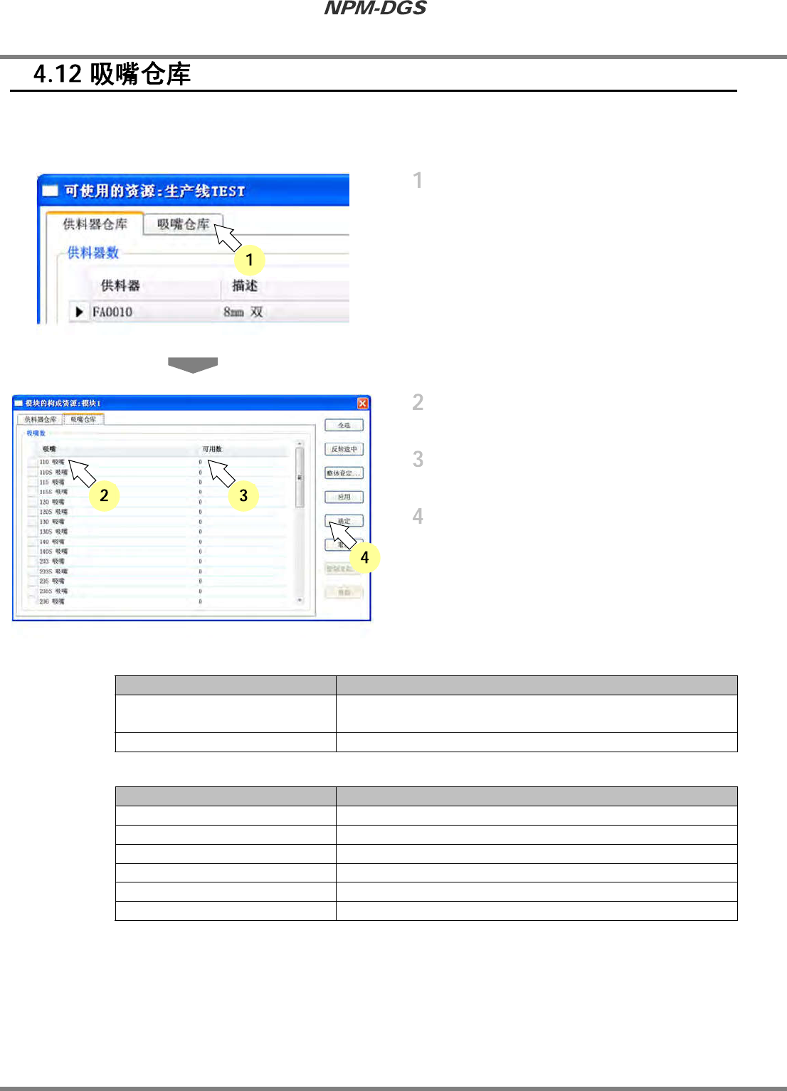 程序手册 4.12 吸嘴仓库 Page4-126 EJS 9AC-MB-04P-40 n 吸嘴总数的设定 在供料器仓库画面上打开吸嘴仓库画面, 编辑各 吸嘴类别的总数。 点击 [ 吸嘴仓库 ] 标签。 · 显示出吸嘴仓库画面。 从 ‘ 吸嘴 ’ 栏中选择吸嘴。 在 ‘ 可用数 ’ 栏里输入拥有的吸嘴数。 点击 [ 确定 ] 。…