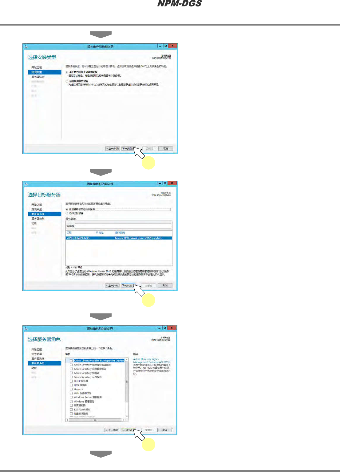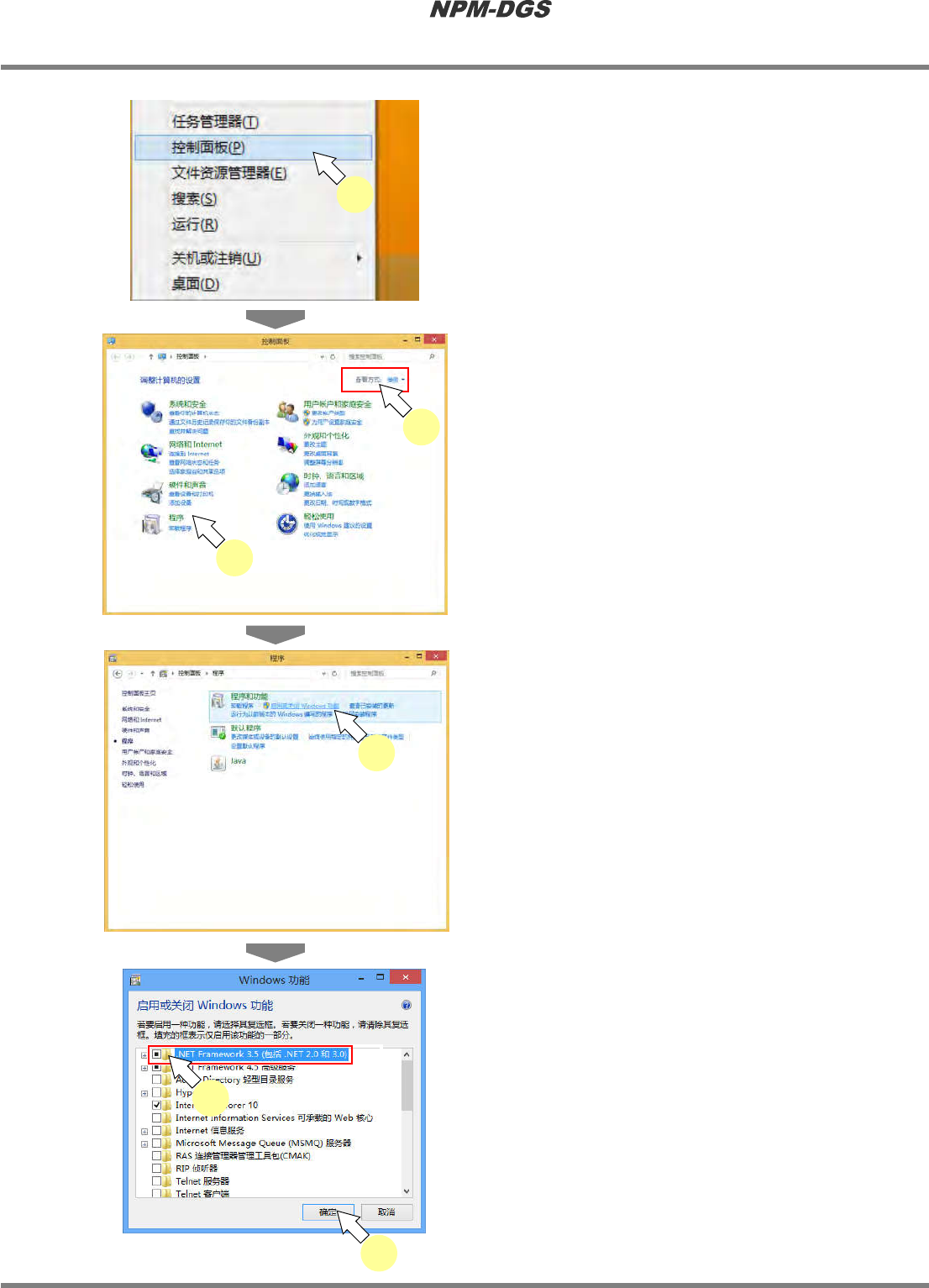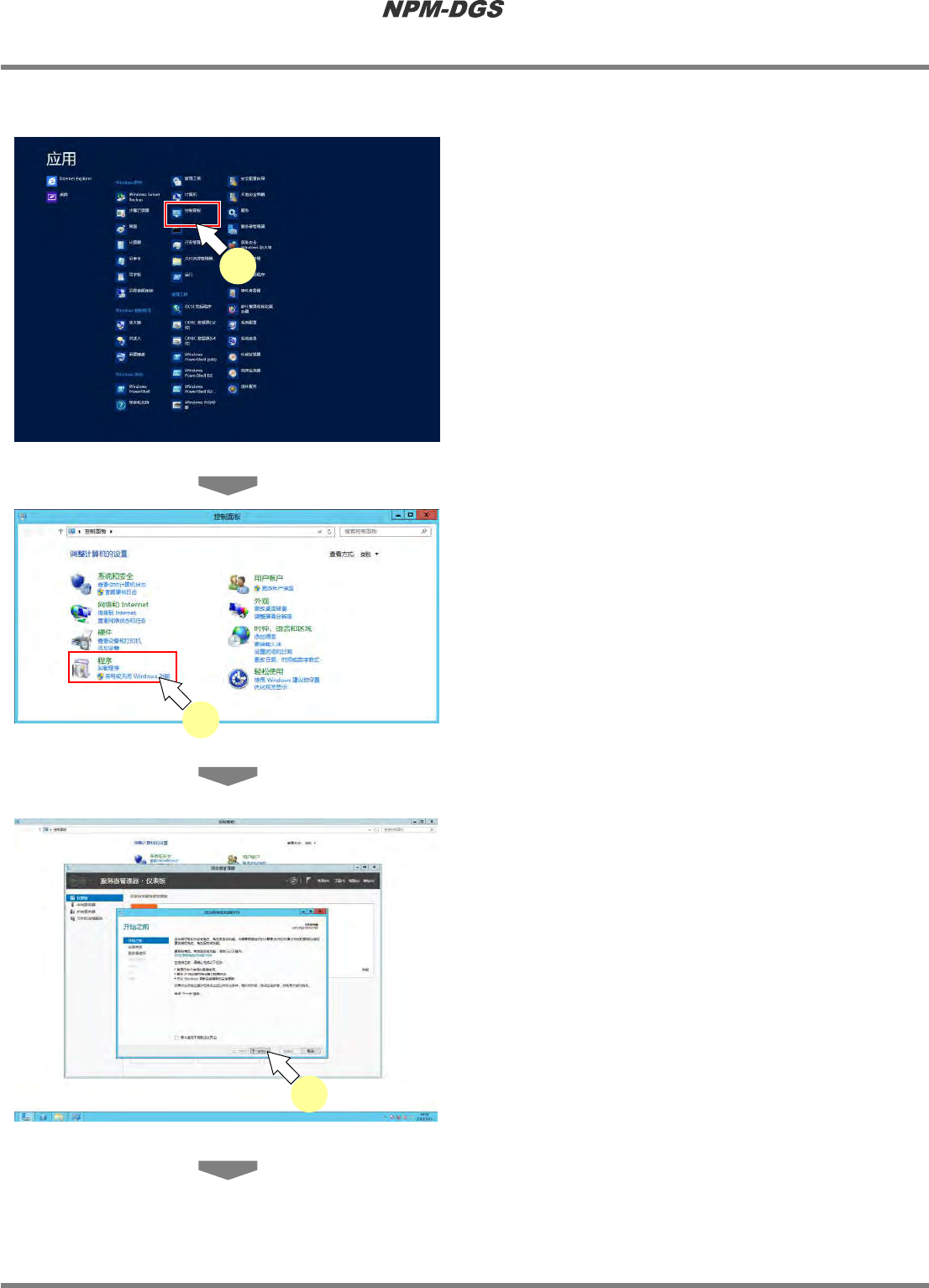 程序手册 2.1NPM-DG S 的安装 Page2-6 EJS9AC-MB-02P-22 n OS 为 W indow sSer ver2012 时 1 在按住 [W indows ] 键的同时, 按 [Q] 键打 开应用画面。 2 点击 [ 控制面板 ] 。 3 点击程序的 [ 启用或关闭 Windows 功 能 ] 。 …