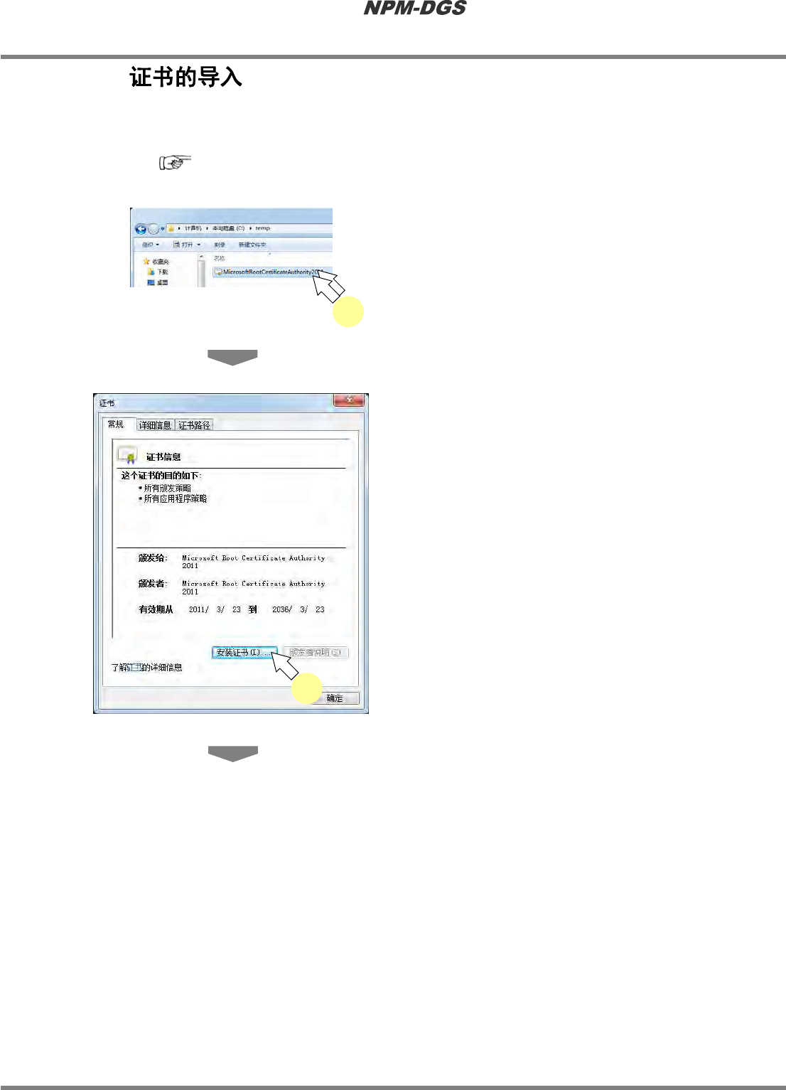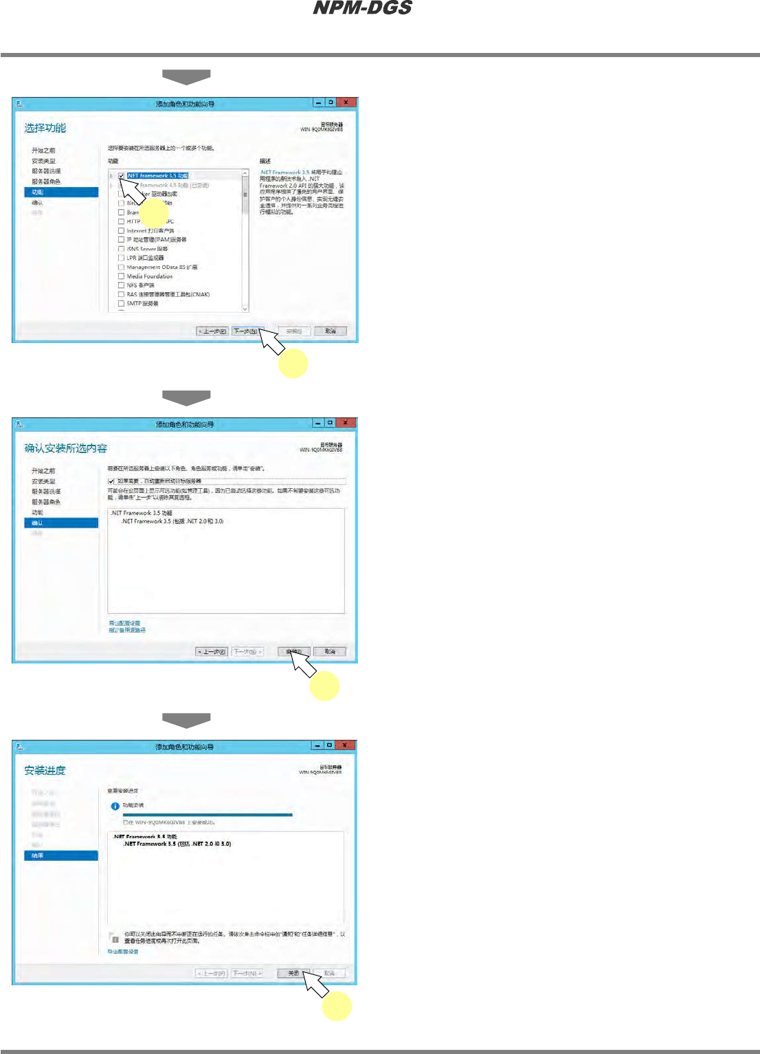 程序手册 2.1NPM-DG S 的安装 EJS9AC-MB-02P -22 Page2-9 2.1.2 在没有连接互 联网的环境下,以 及没有所需 的证书时,需 要在安装之前先导入 证书。 如果在 .NetFramework4.6.2/ .NetFramework 4.7.2 的安装 时设定失败, 请执行这项操作后再对安 装进行确认。 ‘14. 故障排 除■ DGS 单机 / 服务器…