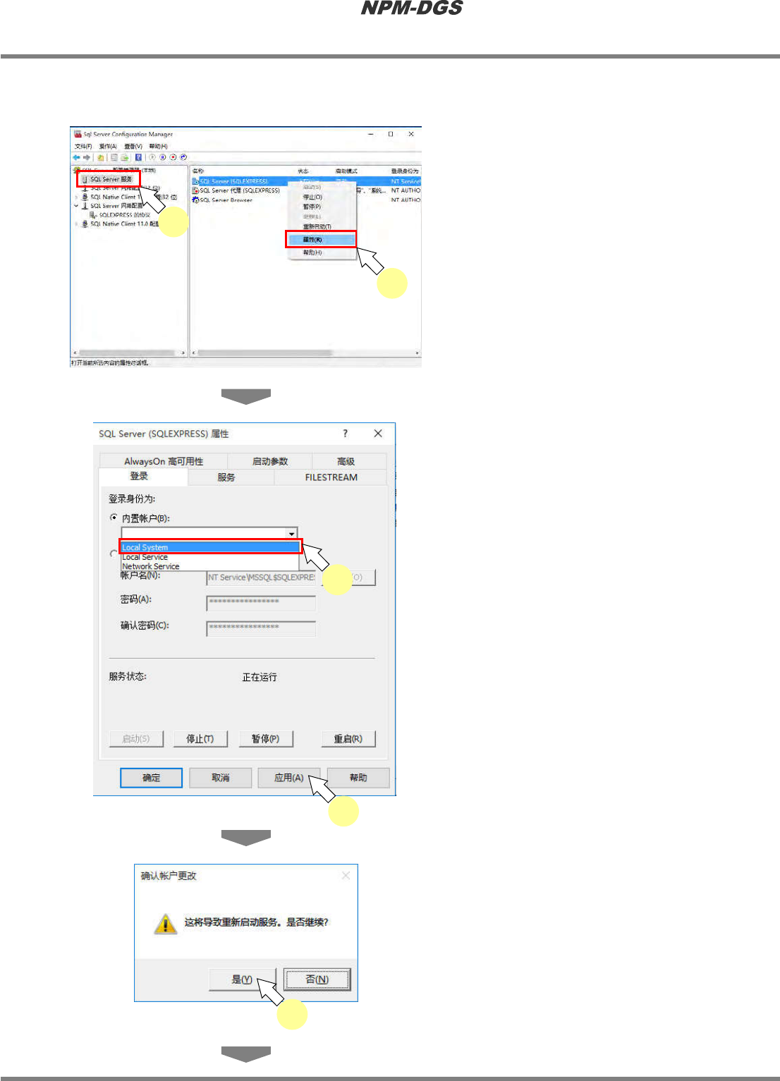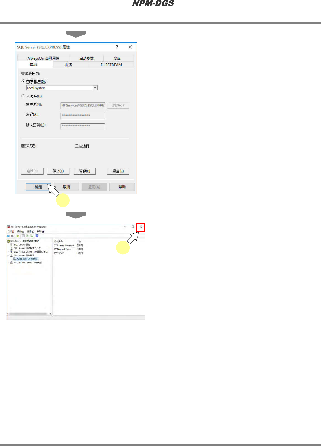 程序手册 2.1NPM-DG S 的安装 EJS9AC-MB-02P -22 Pag e2-49 ⑤ 变更 SQLServer(SQLEXPRESS) 的登录设定 l 如果版本为 10.05.00 之后的 版本,则无需 本项设定。 1 选择 ‘SQ LServer 服务 ’ 。 2 在 ‘SQLServer(SQLEXPRESS)’ 上右 击,然后点击 [ …
