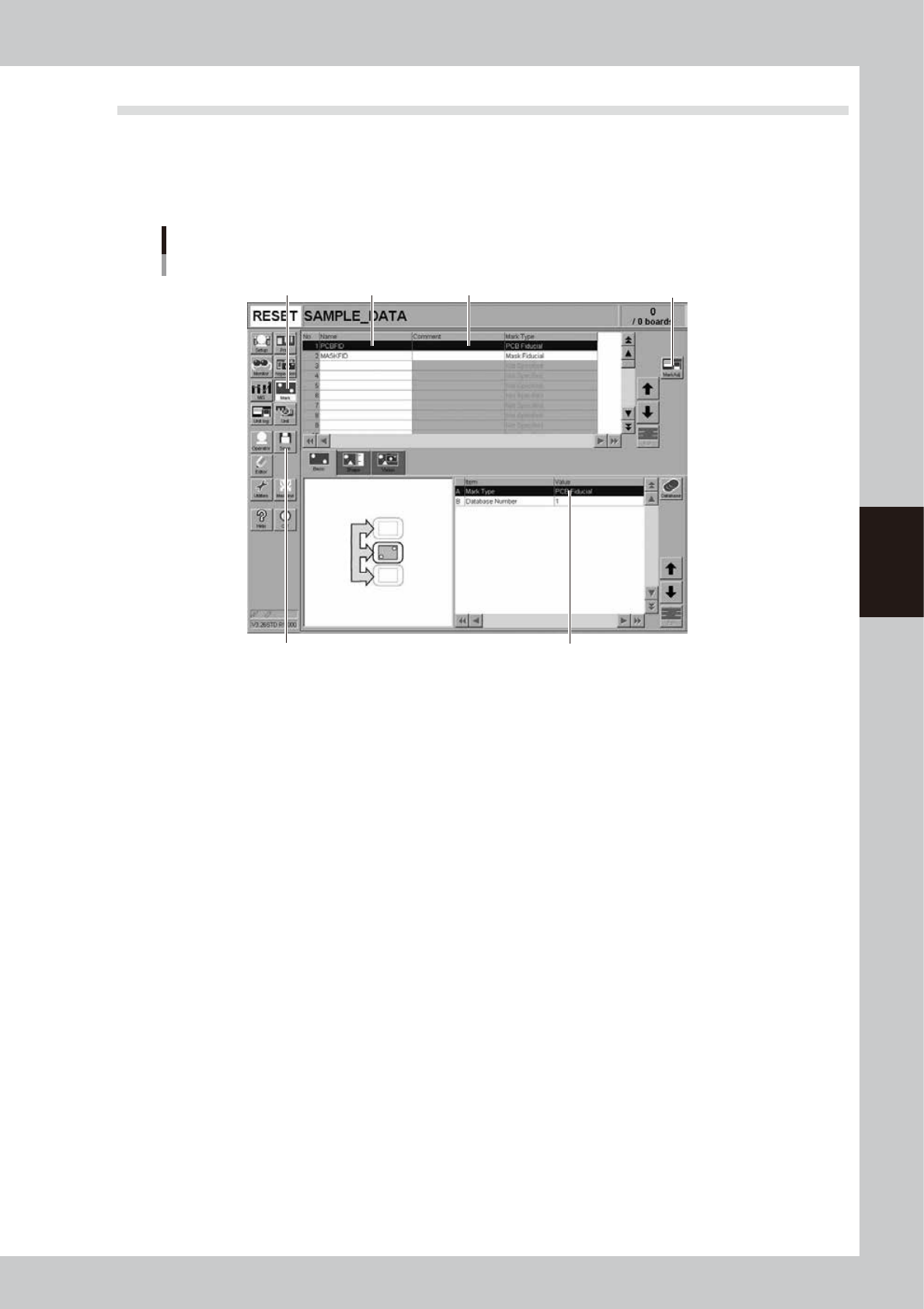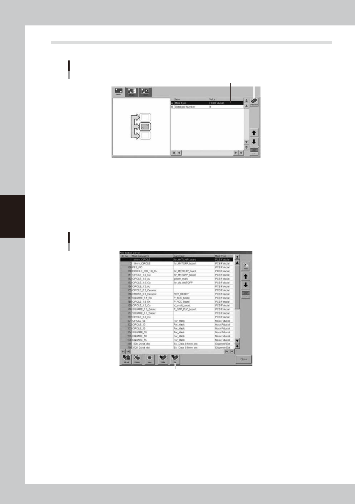 4-33 4 Creating and setting the data 7.1 Creating procedure Pressing the Mark button in the menu button area opens the Mark screen as shown below . Enter the mark name and comment in the data No. list on the upper part o…