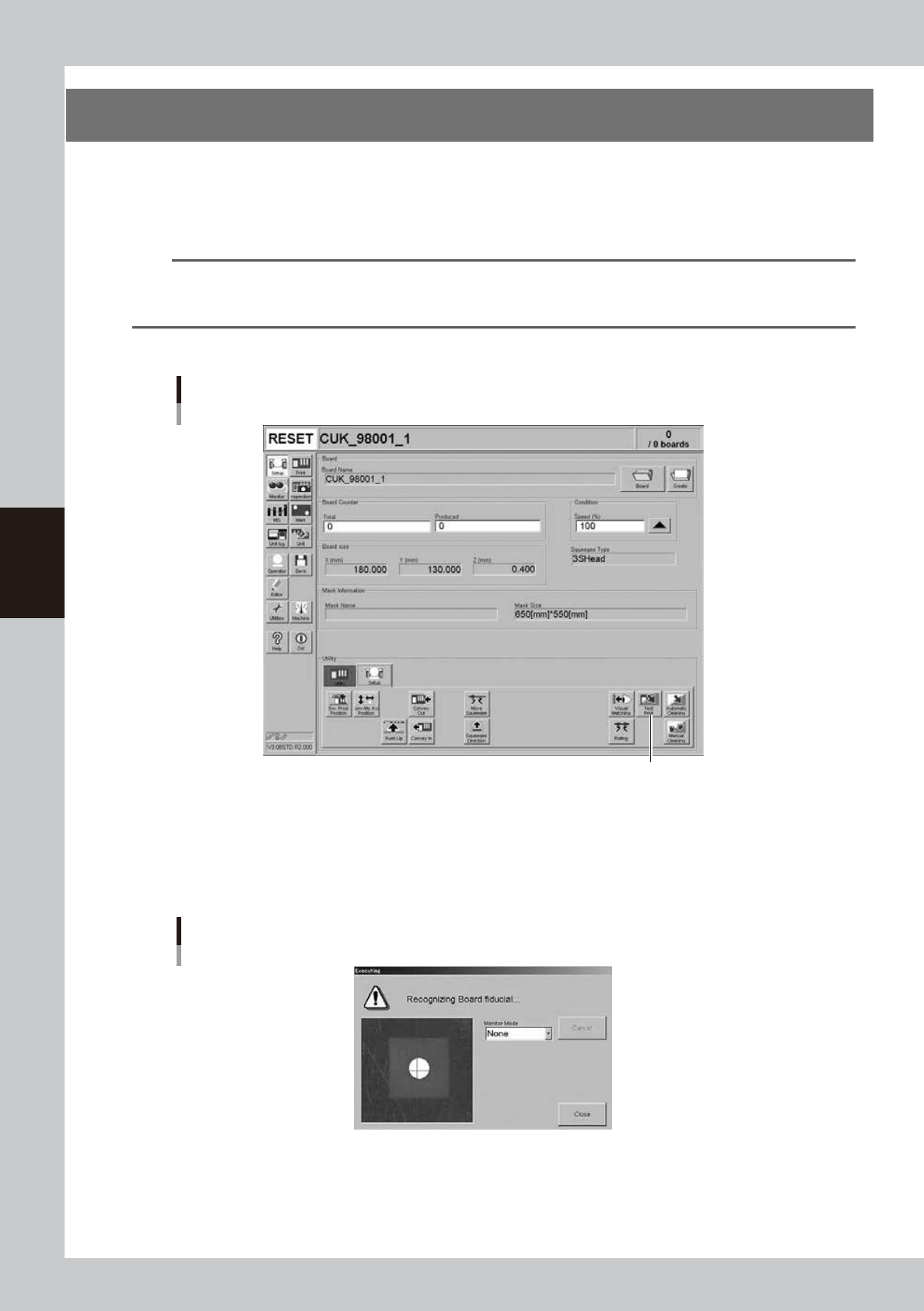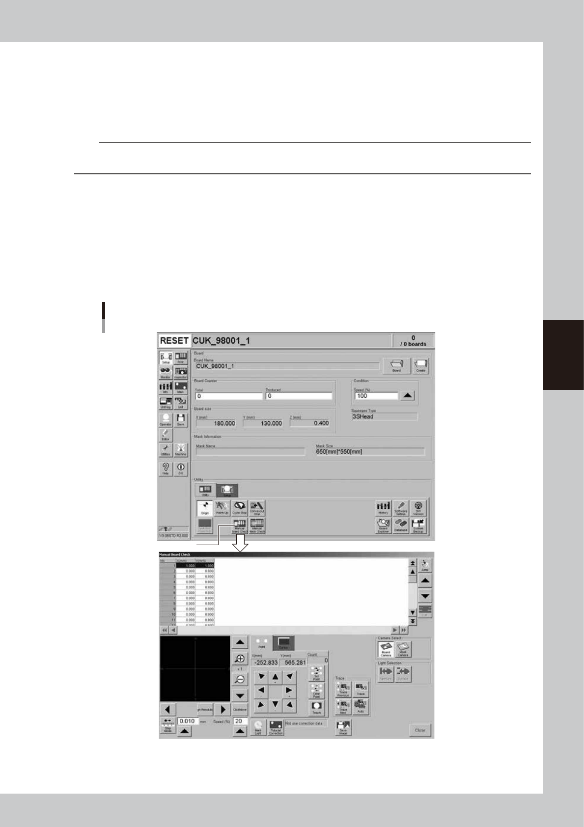 1. Open the [Utility] tab on the Setup screen and press the [Manual Board Check] button.