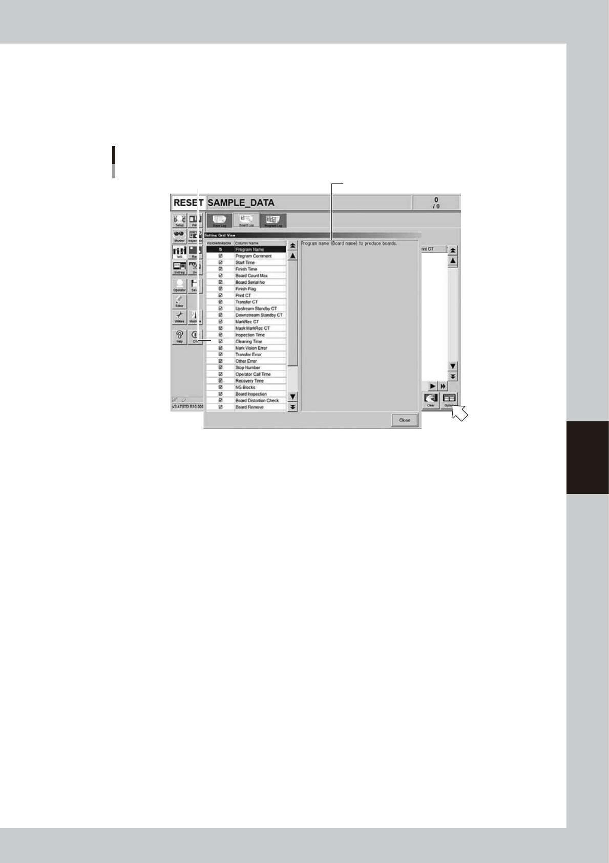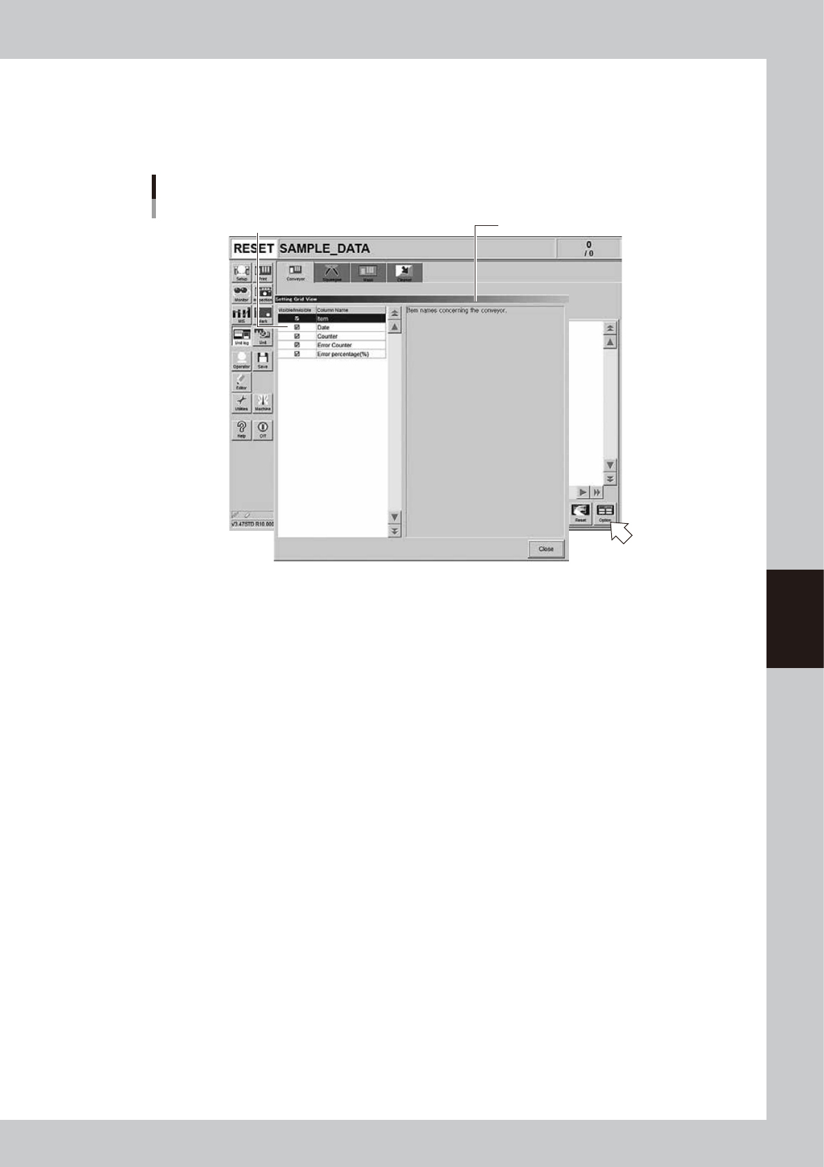 right of the "Unit Log" screen. Pressing the [Option] button opens the "Setting Grid View" screen as shown below.