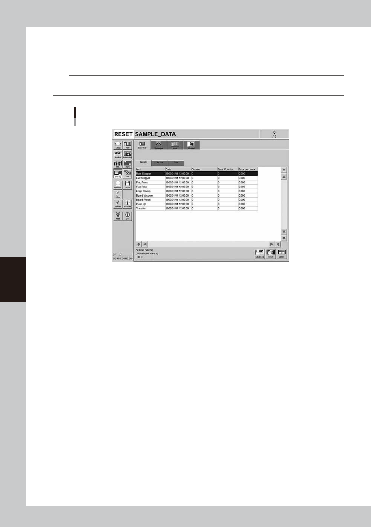The operation log of each conveyor unit, such as exit stopper, flap, board pickup, and push-up is displayed.