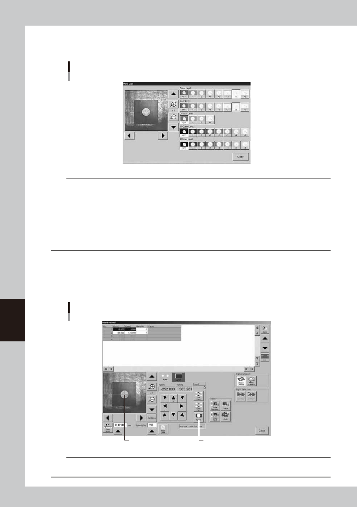 Optimum light levels depend on the materials of the board, mask frame and mark. Use the following method to find